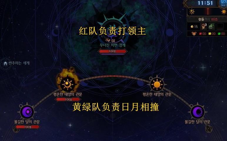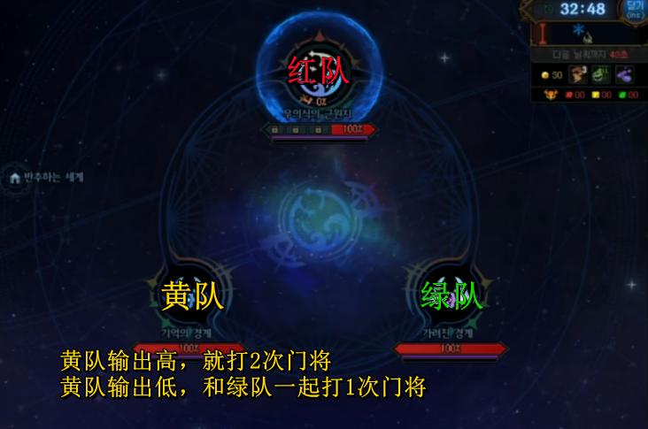 打完第一輪後,紅隊和黃隊分別進入剩下的2個區域,綠隊負責壓制各區域狂暴值即可!