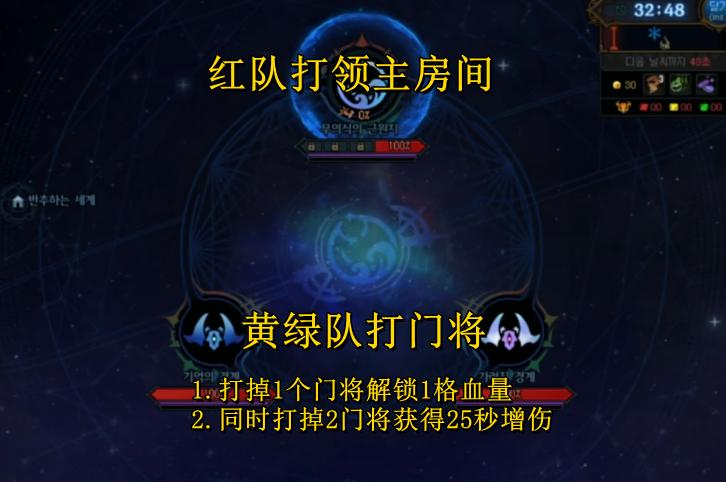 【3.推薦流程】紅隊直接進霧神大領主房間,黃綠隊分別進下方的2個門將圖,可以約好時間一起打掉2個門將,如此就可以解鎖霧神2格血量,並且獲得25秒爆發時間。