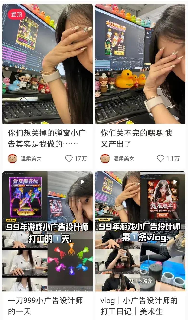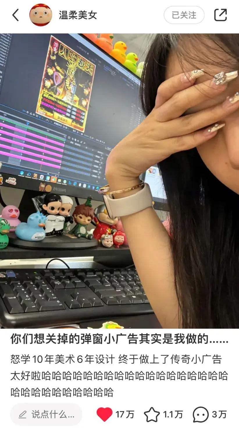 前段時間在小紅書上,有位網友發帖說“你們想關掉的彈窗小廣告其實是我做的”,而從她分享的電腦頁面截圖來看,她正是在爲“骷髏打金服”製作廣告素材。