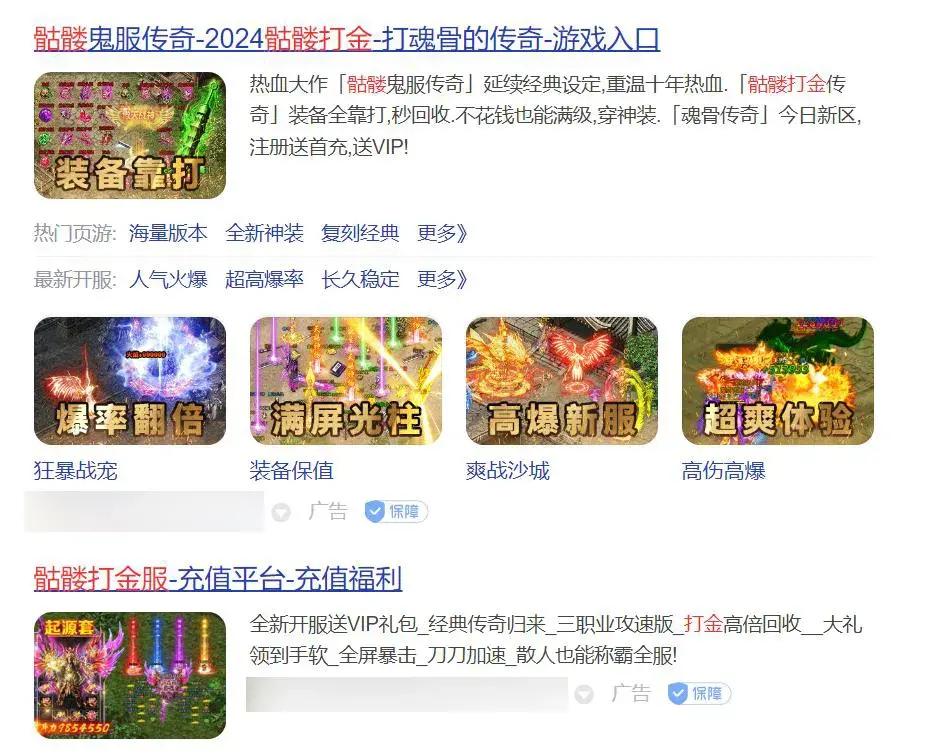 現在搜索“骷髏打金服”,不管是買量廣告還是正常的搜索結果,會指向幾十上百種不同的類傳奇頁遊。它們有的是“鬼服傳奇”,有的是“骷髏傳奇”,但還有更多結果指向了叫不出名字的、五花八門的傳奇。