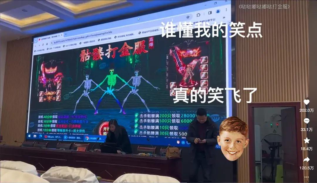 伴隨着“滴滴滴哩嘀嘀嘀哩等待”的魔性歌聲響起,三隻骷髏就這樣在花裏胡哨的界面上縱情起舞,頭頂醒目的“骷髏打金服”。臺上的老師一時手忙腳亂找不到關閉按鈕,臺下的學生們則笑成一團。