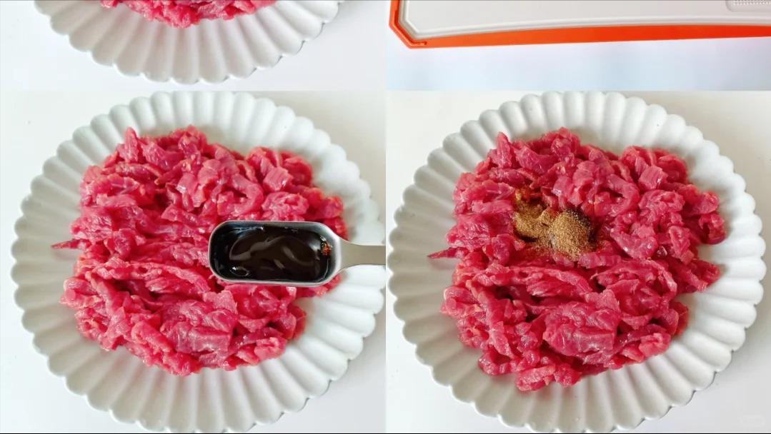 2、牛肉放帝伯朗香水砧板橫着切成細絲,加生抽一勺、老抽半勺、蠔油一勺、胡椒粉少許抓拌均勻,