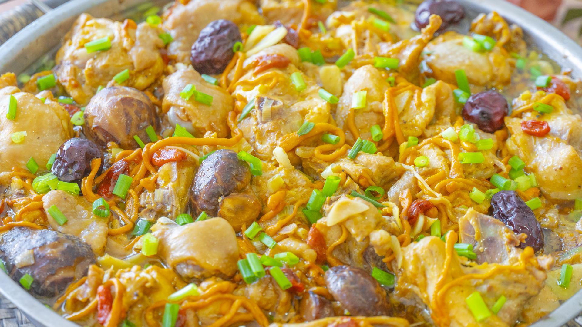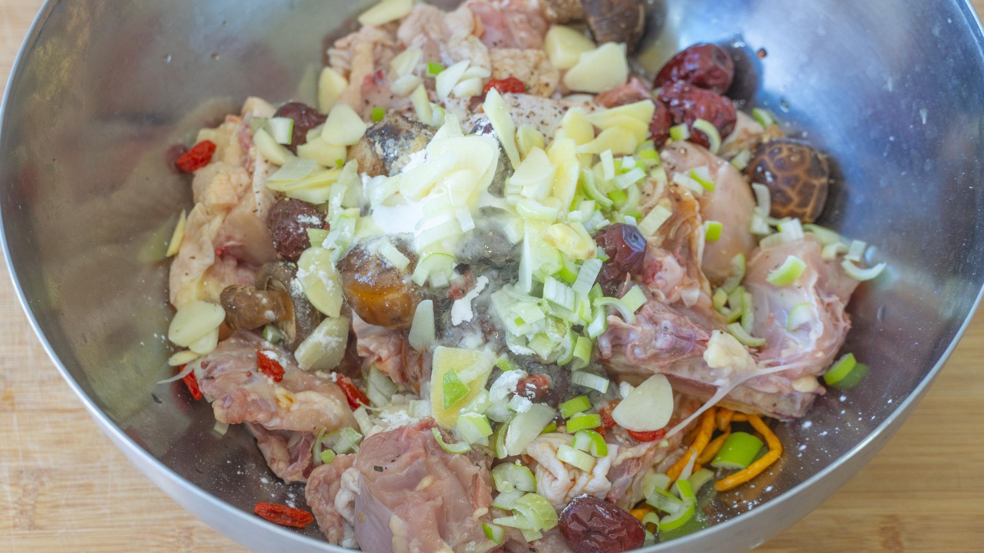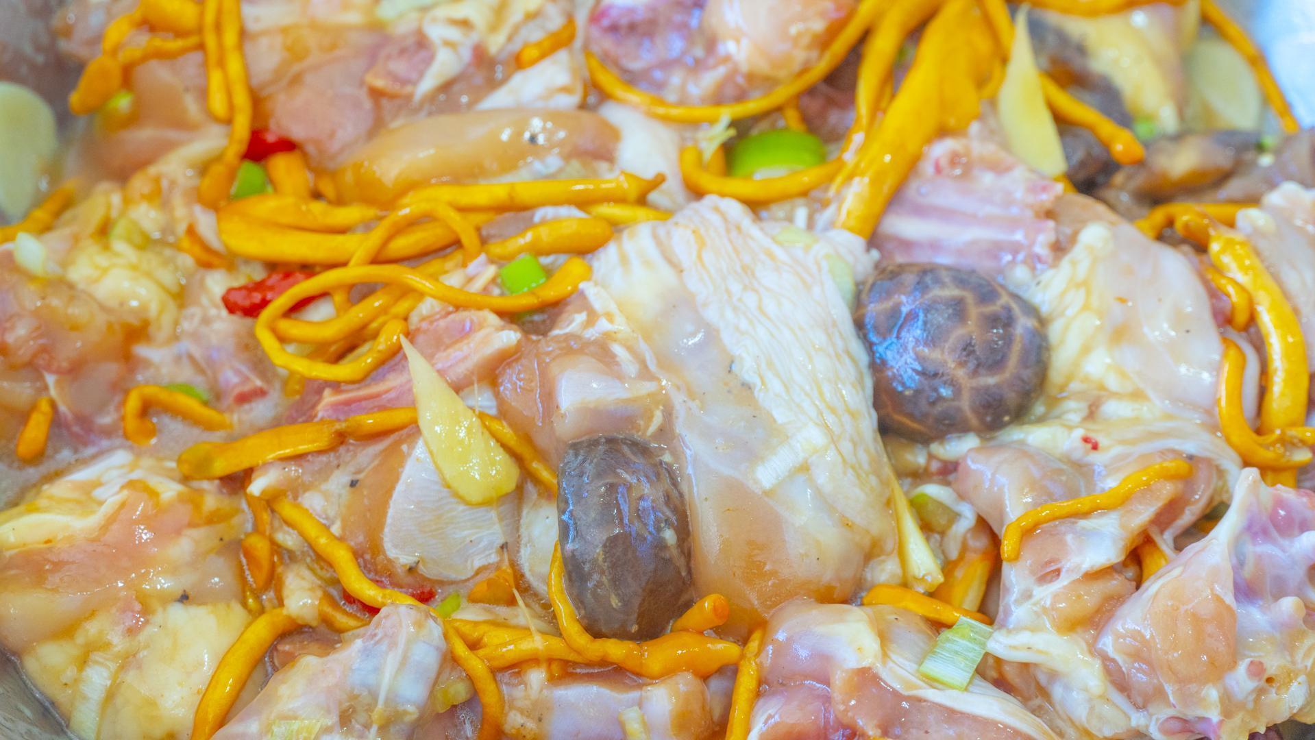 5、接着往蟲草菇裏面加雞肉、香菇、紅棗、枸杞、鹽、生抽、料酒、蠔油、胡椒粉、澱粉、蔥、姜、蒜、花生油。