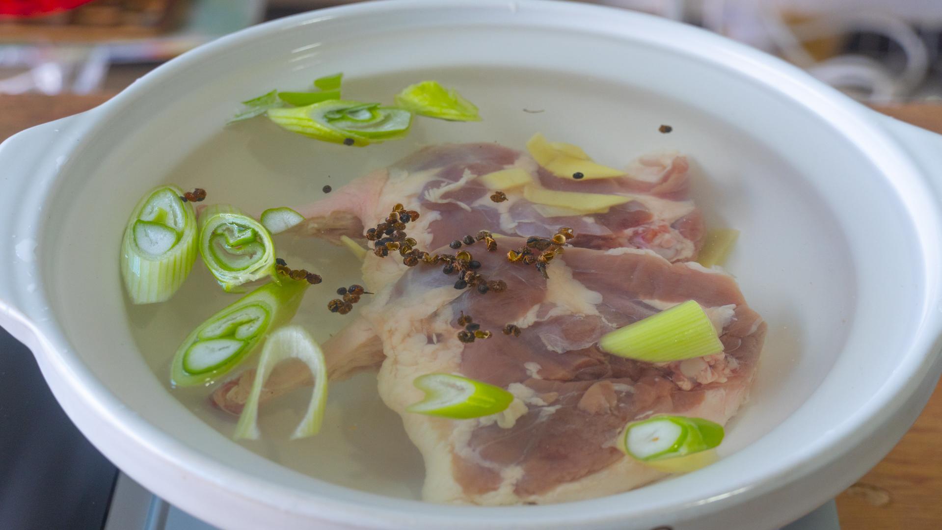4、起鍋燒水,冷水下入鴨腿,然後加蔥、姜、料酒、花椒去腥。大火煮開後先用勺子撇去浮沫,然後轉小火繼續燉20分鐘。