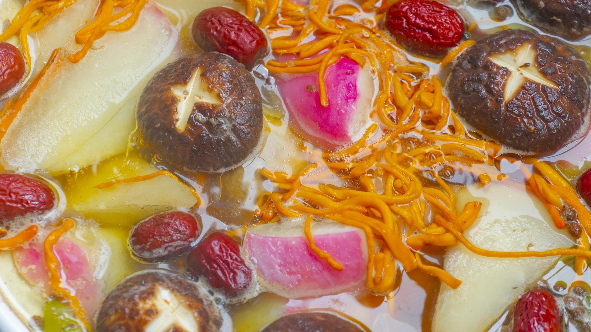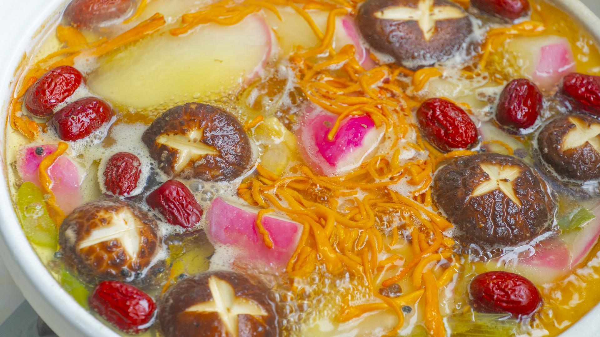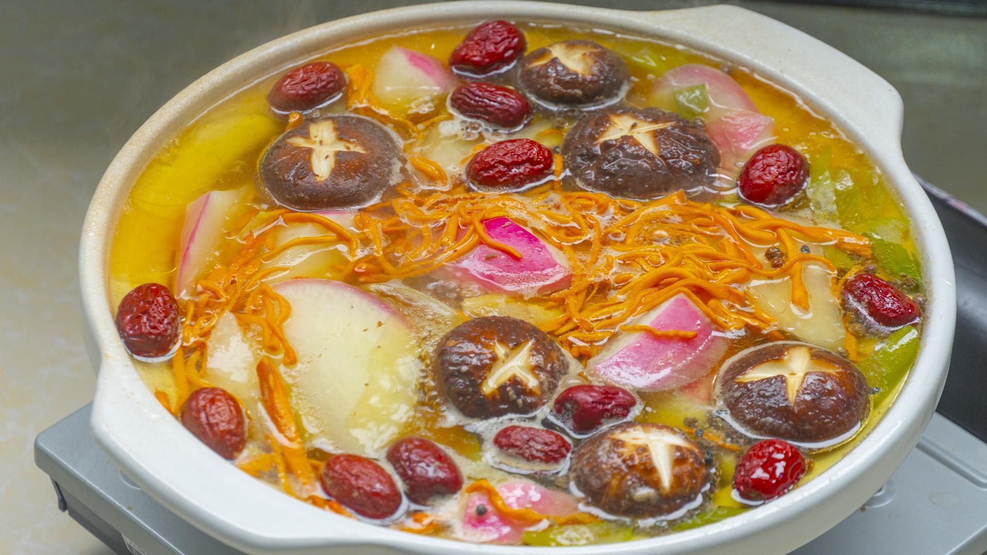 5、20分鐘後倒入蘿蔔、蟲草花、香菇、紅棗,蓋上小火繼續慢燉30分鐘。