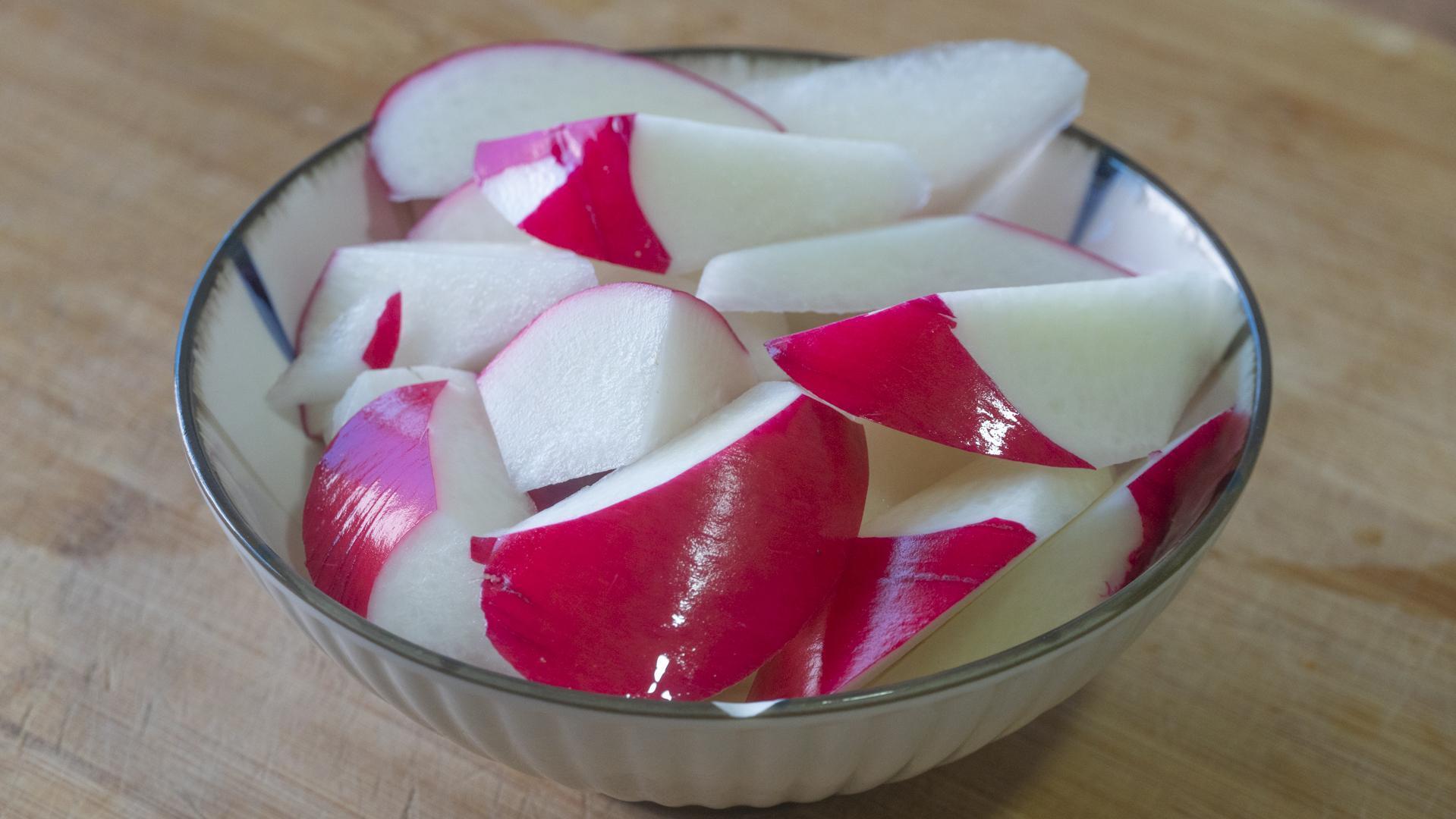 2、一個蘿蔔,洗淨後不用削皮,直接切塊兒就行,然後裝起來備用。
