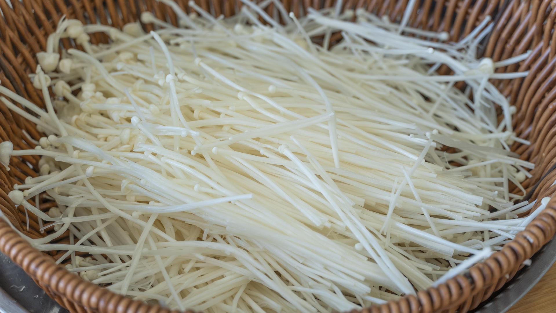 2、金針菇一小把,先切掉根部,然後掰成小朵後清洗乾淨,接着也瀝乾水分備用。
