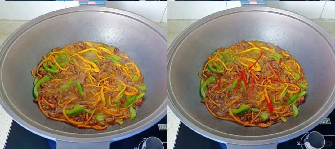 4、鍋裏放少許油,涼油下蒜末炒香,加牛肉絲爆炒到變色。