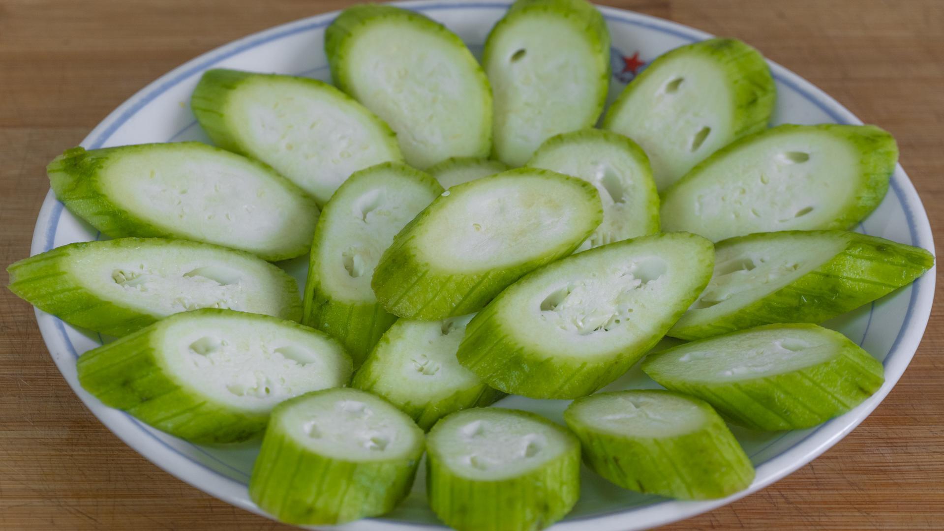 4、絲瓜1條,清洗乾淨後先削皮。斜着切片,可以切厚一點。