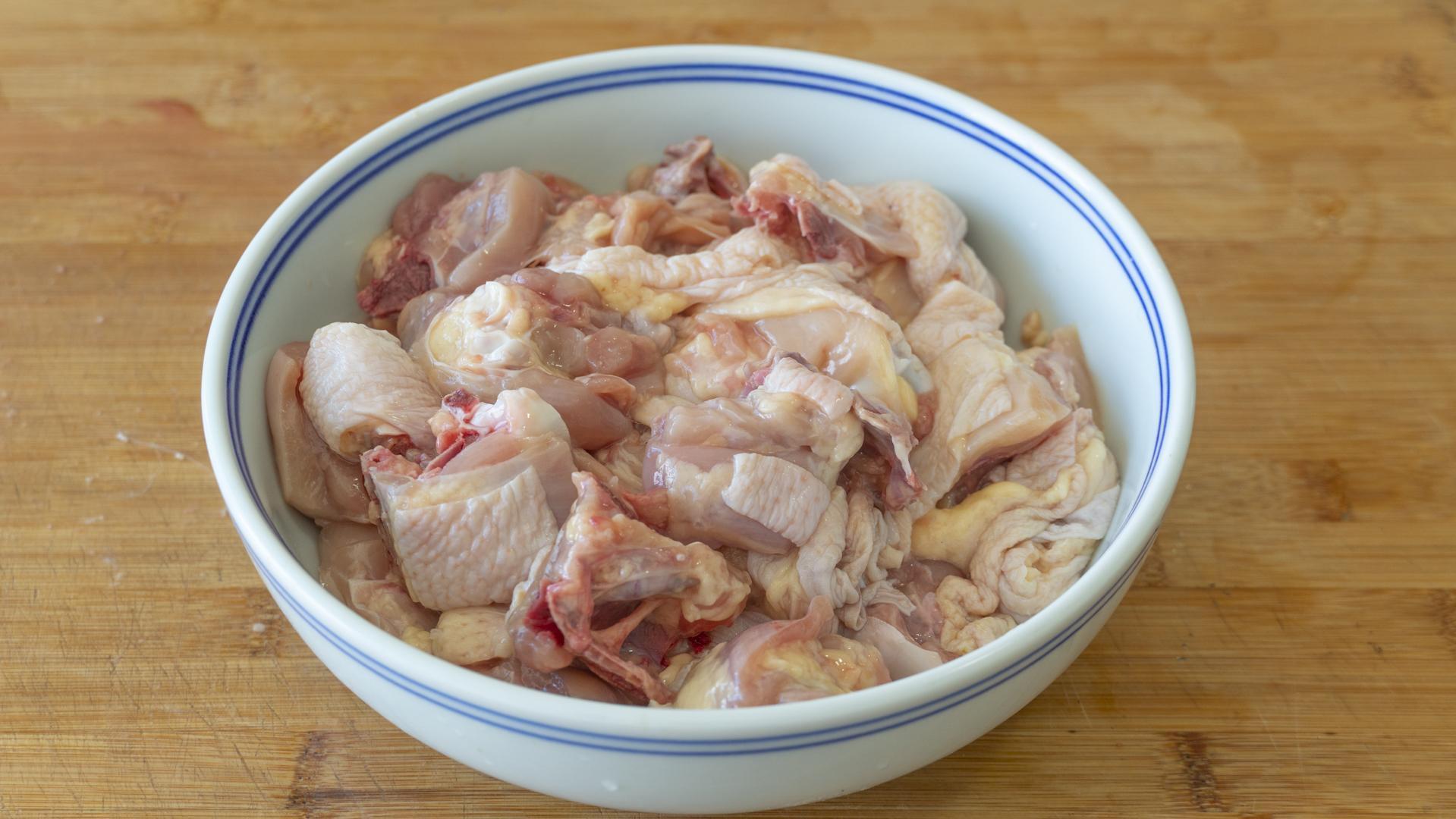 1、半邊雞腿2個,加鹽、麪粉、清水清洗乾淨。剁成小塊兒,然後裝入碗裏,再加清水泡1個小時。