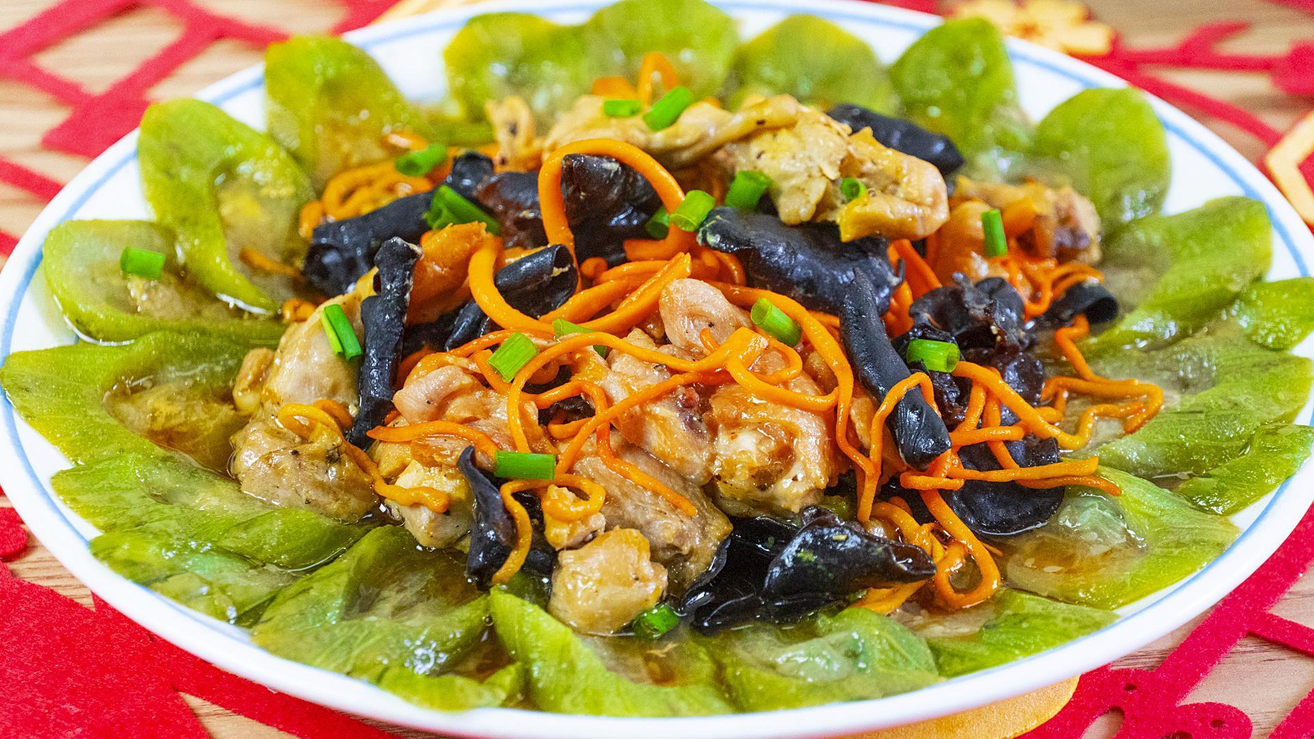 6、晾乾水分的蟲草菇直接倒入雞肉裏面,再把泡好的木耳也倒進來,抓拌均勻後準備一個盤子,先鋪上一層絲瓜打底。接着把醃好多的雞肉一起放上來,鋪平整後就可以了。