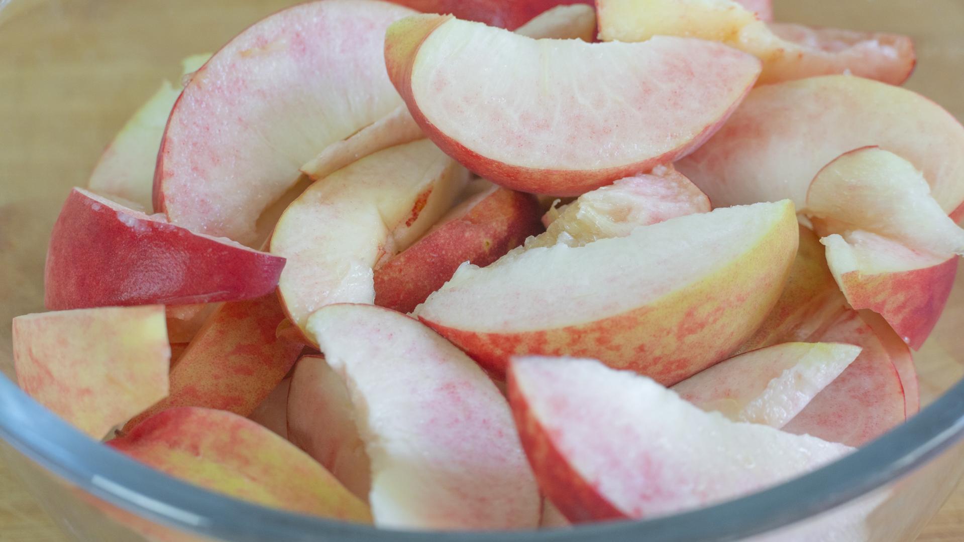 1、桃子3斤,先清洗乾淨,切成小塊。