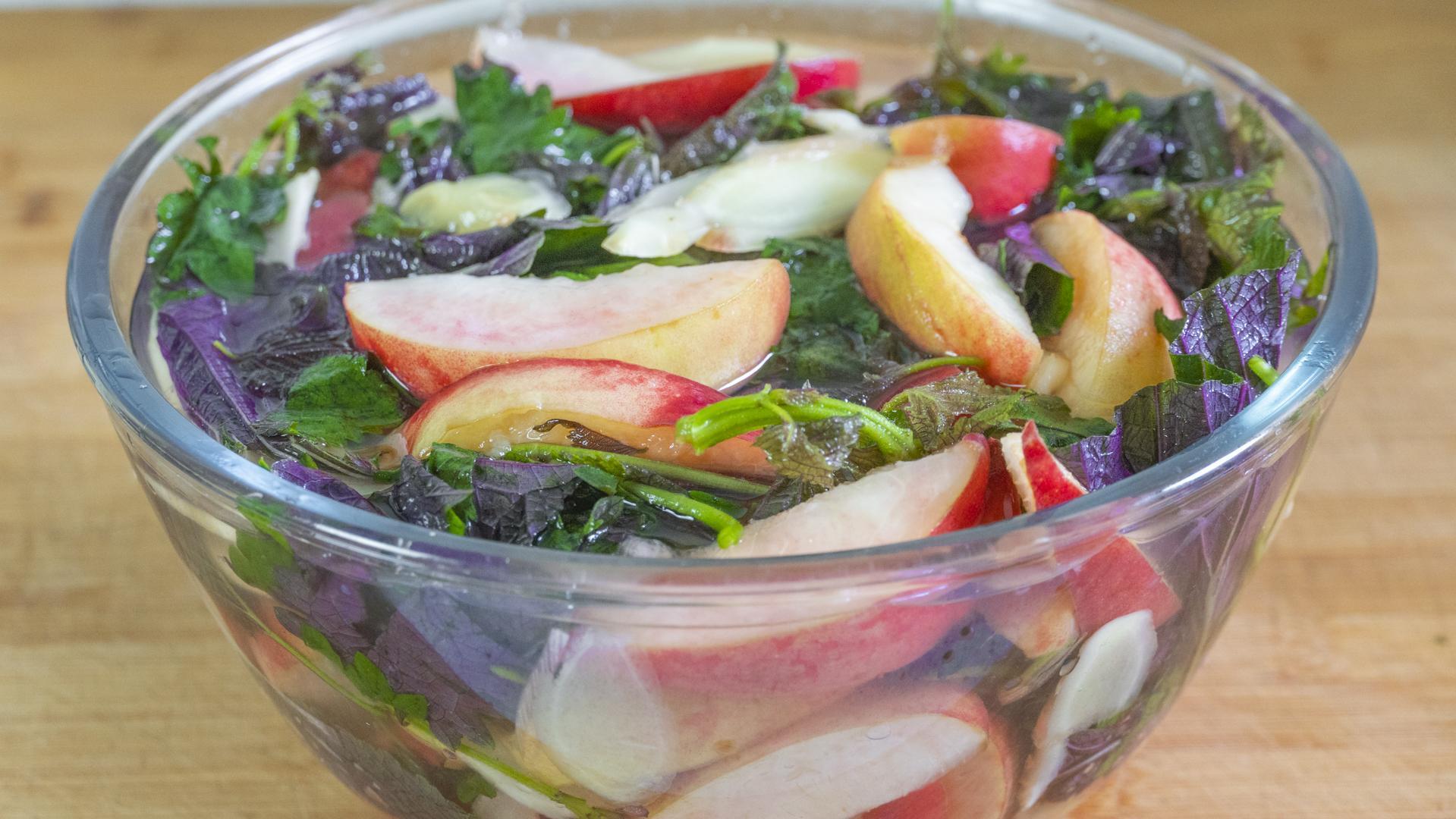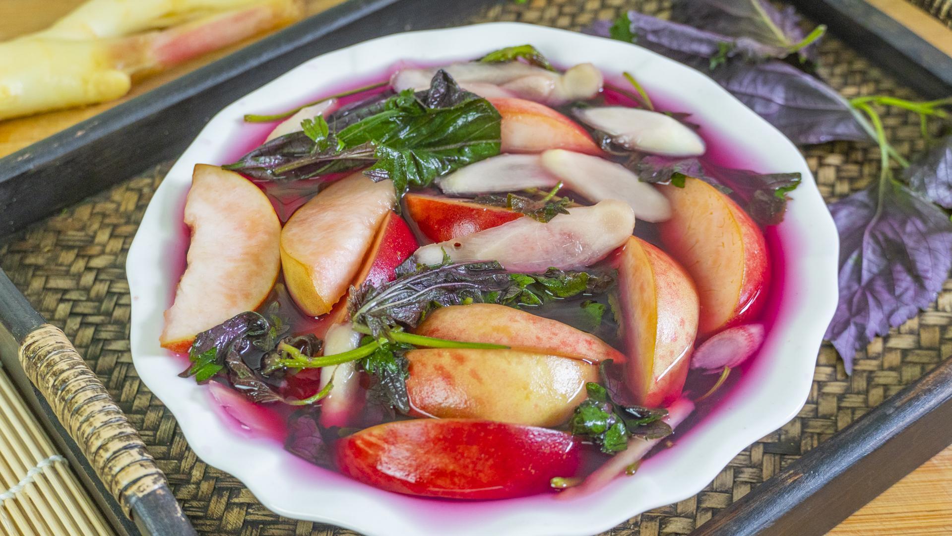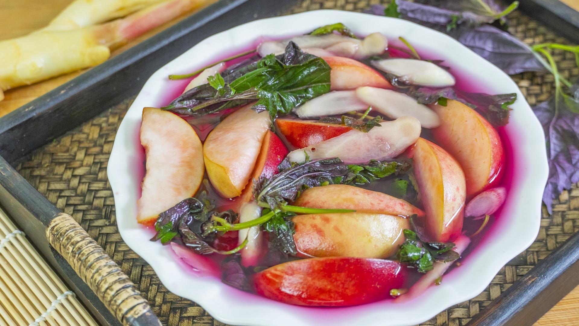7、桃子醃好後加清水多洗兩遍,再把仔姜和紫蘇葉子都加起來,最後再淋入放涼的糖醋汁。