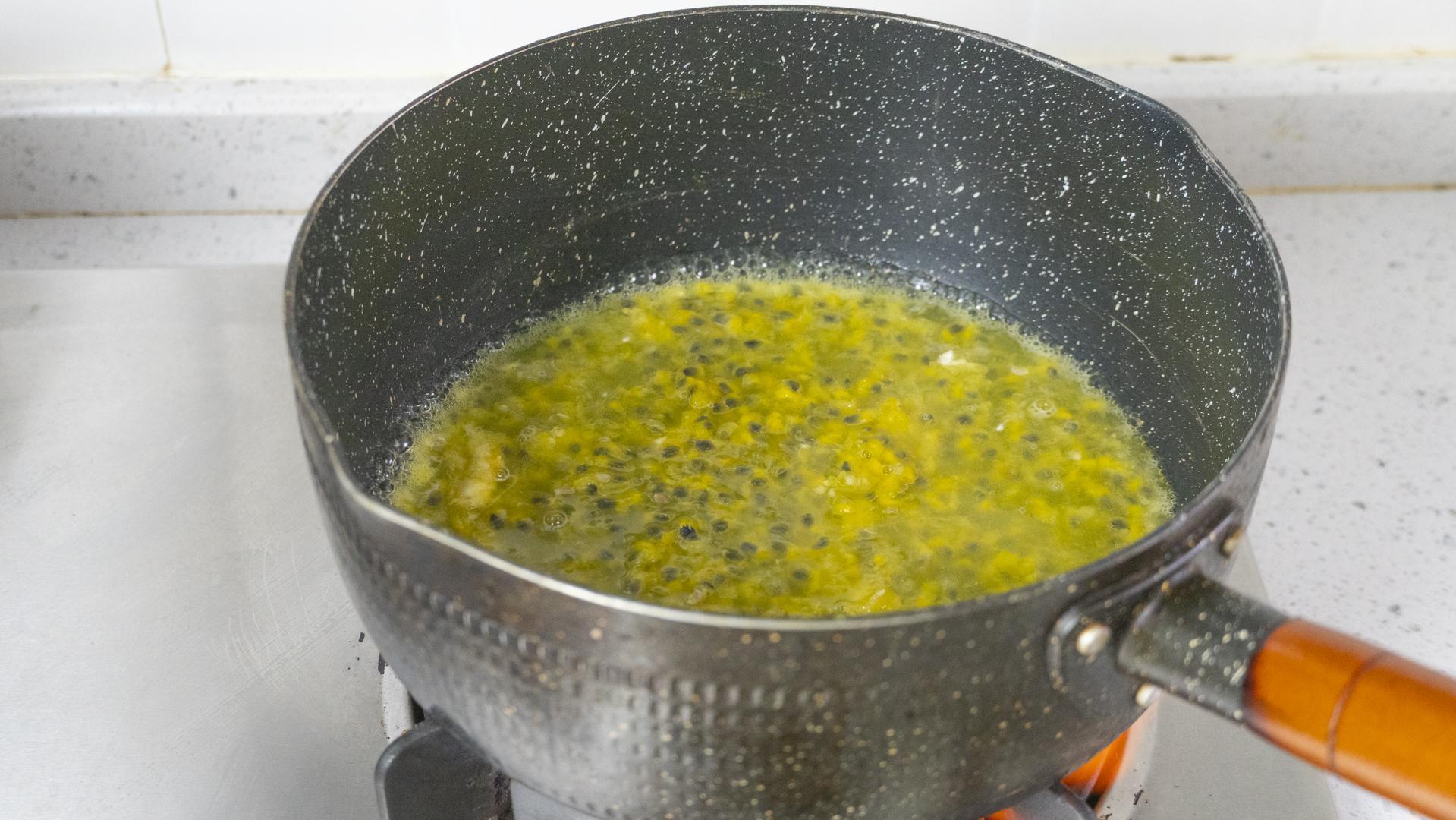 2、先把白糖煮化,接着把鍋裏的百香果汁煮開煮沸騰,煮好後轉小火,讓鍋裏一直保持沸騰的狀態,接着我們去和麪。