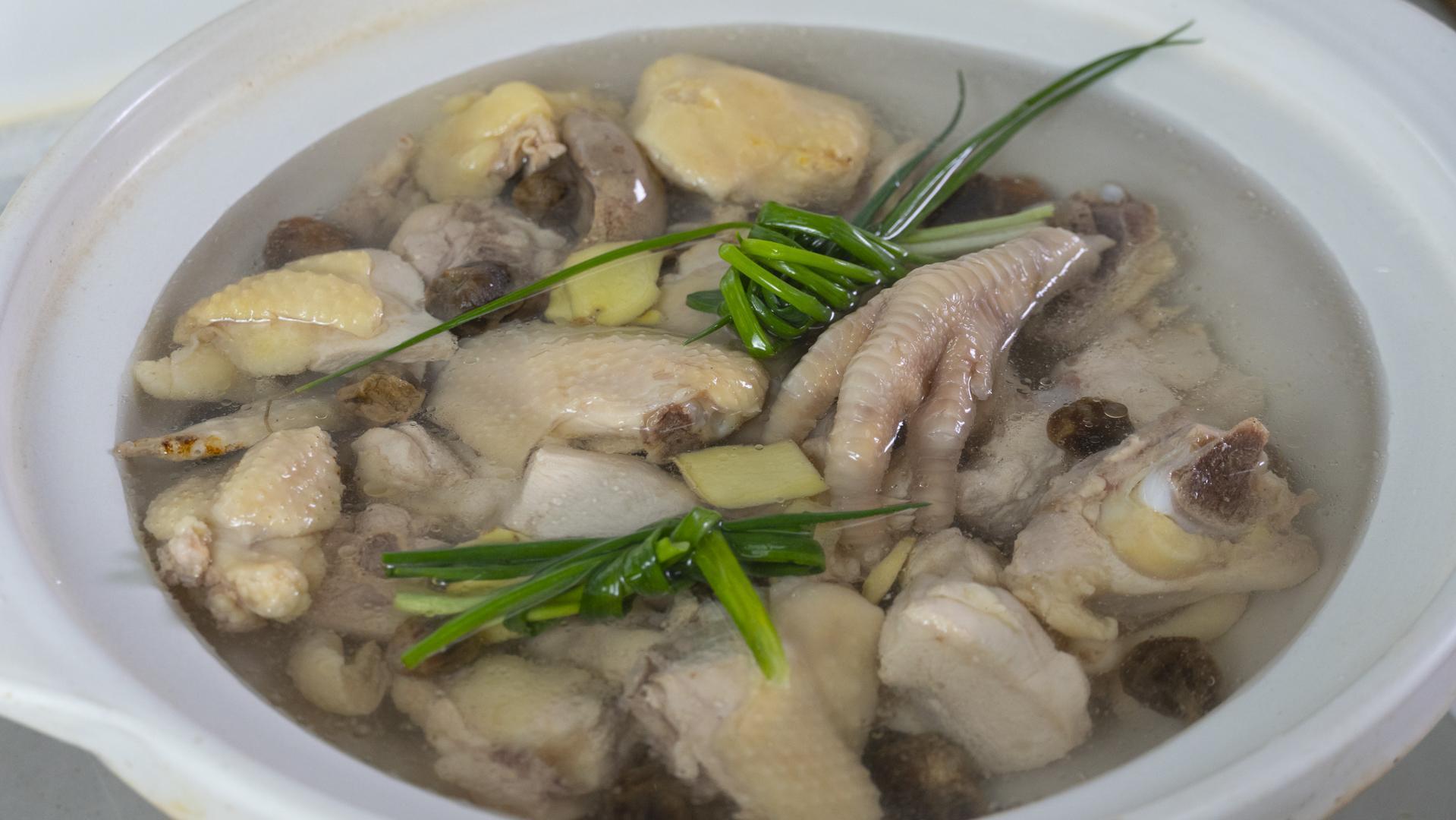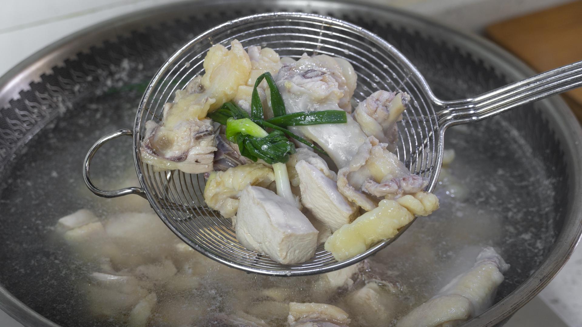 2、起鍋燒水,冷水下雞肉焯水,加蔥姜料酒去腥。