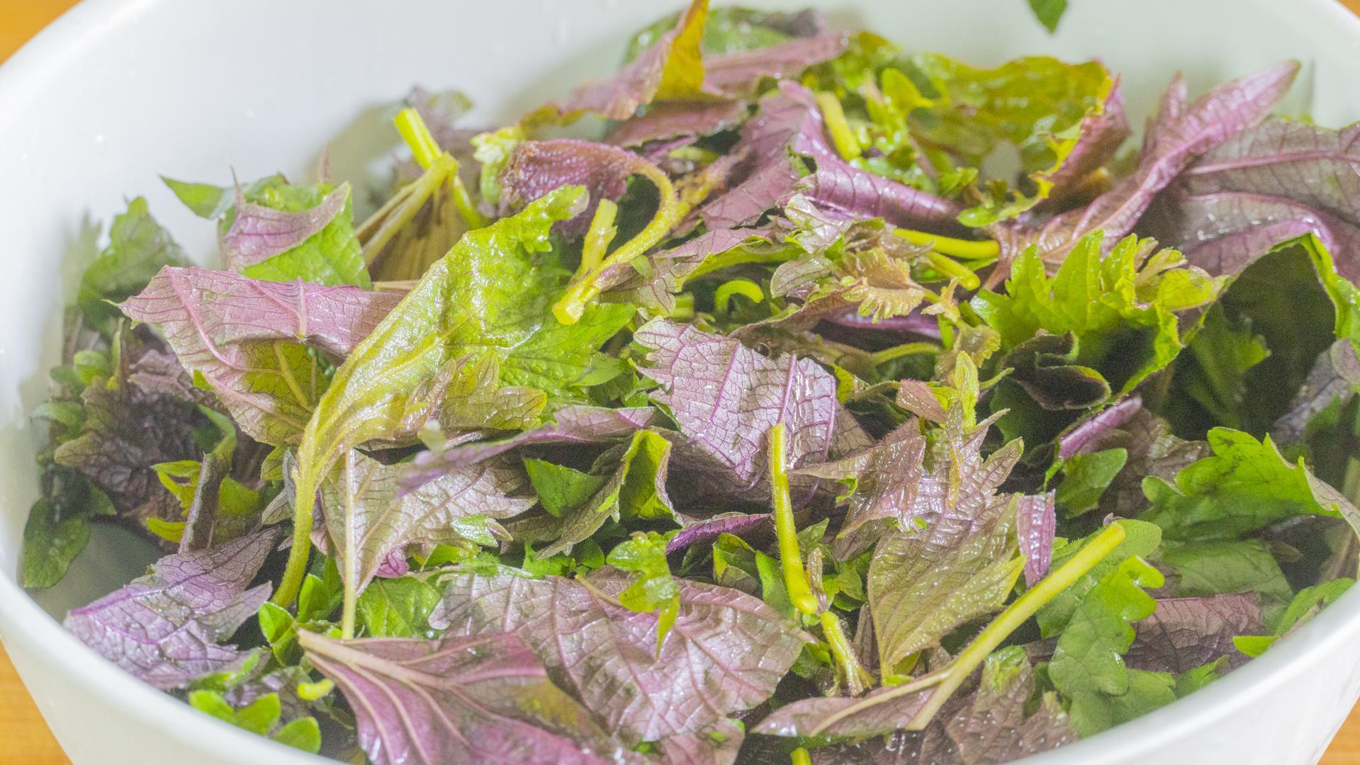 4、紫蘇200克,先把葉子摘下來,清淨後稍微的切小一點。