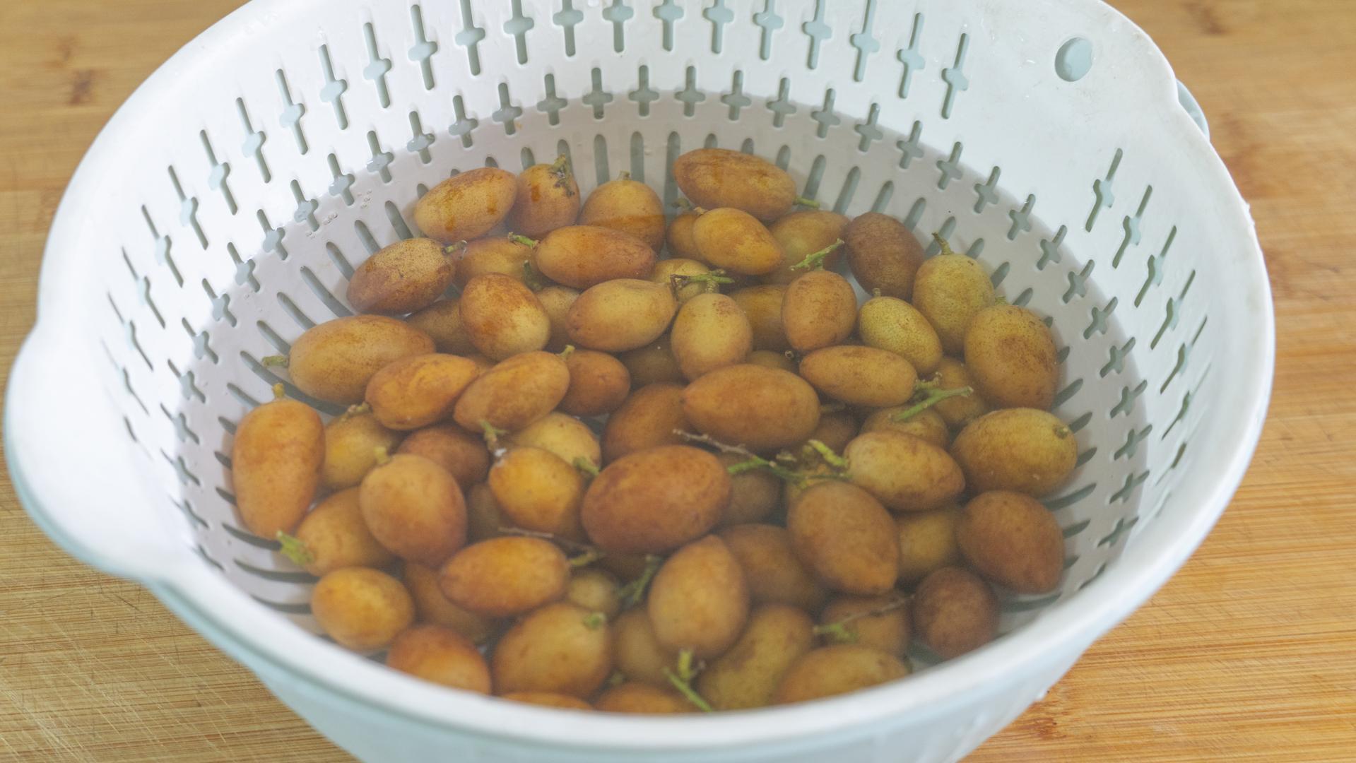 1、黃皮加鹽和小蘇打泡半個小時,用力搓黃皮表面的毛。