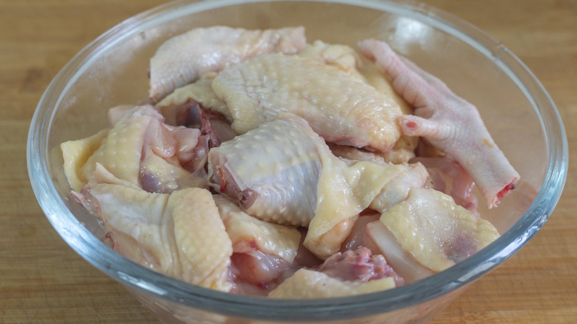 1、新鮮的土雞半隻,先剁成大塊兒,然後清洗乾淨。