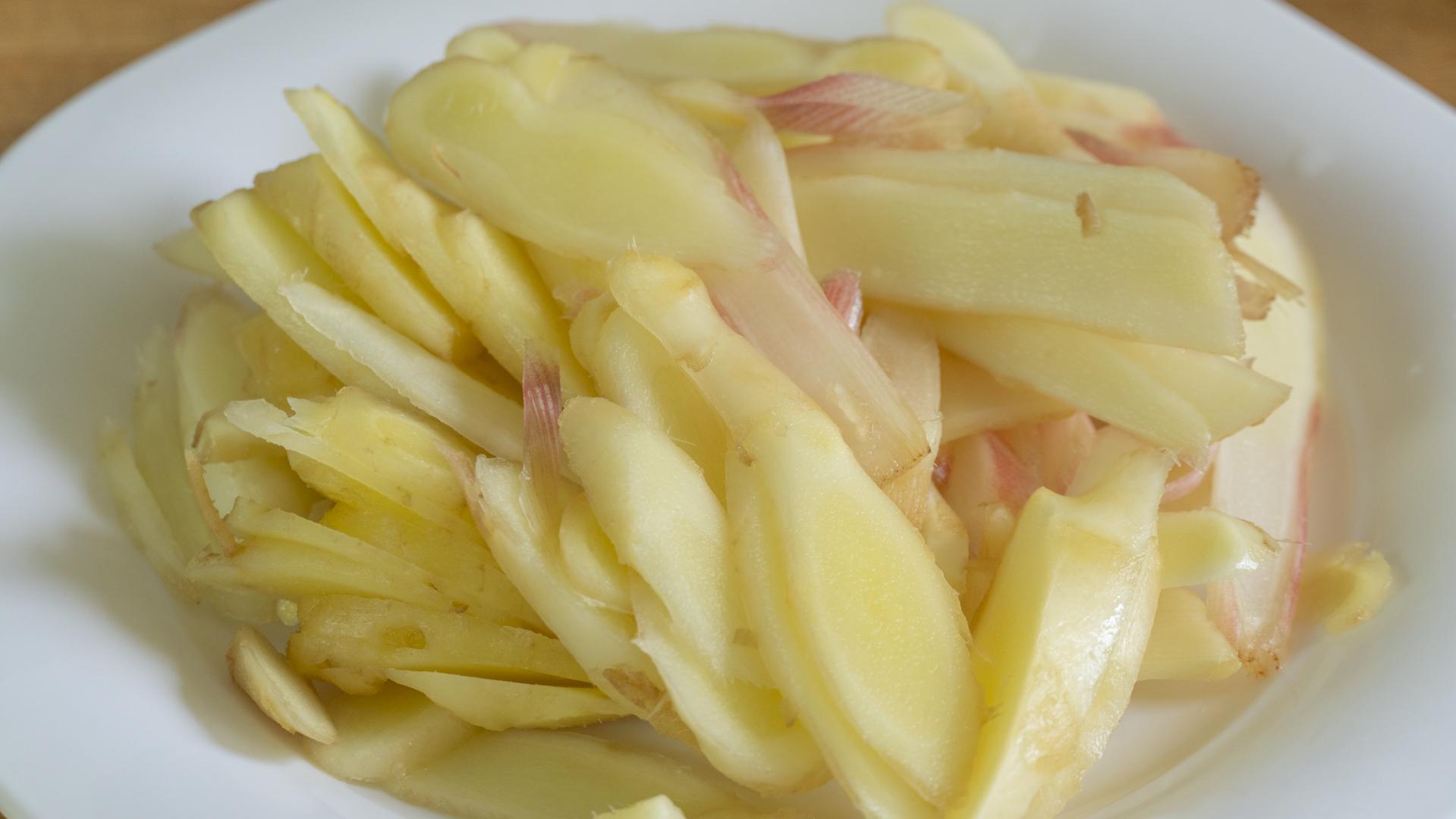 3、仔姜1斤,掰成小塊兒後清洗乾淨,晾乾水分後切成片。