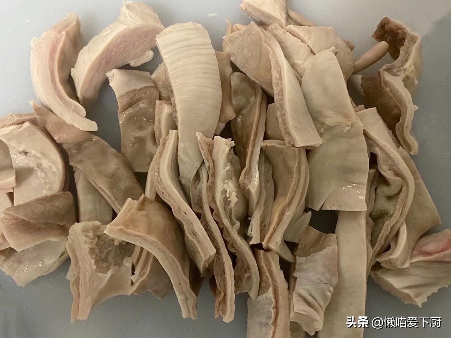 2、用廚房剪刀剪掉豬肚裏面的油脂、刮掉白色薄膜,洗淨後切成小塊狀;