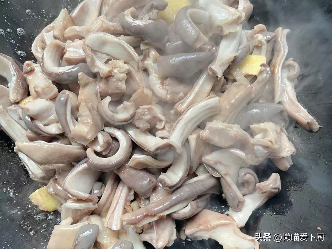 4、鍋中加油,下入薑片炒香,先倒入豬肚,大火翻炒至微微變黃;