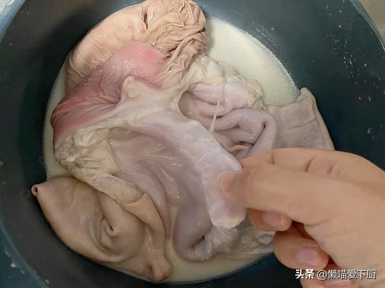 1、撒些麪粉到豬肚上,用力反覆搓洗乾淨,再下沸水中焯燙出浮沫;