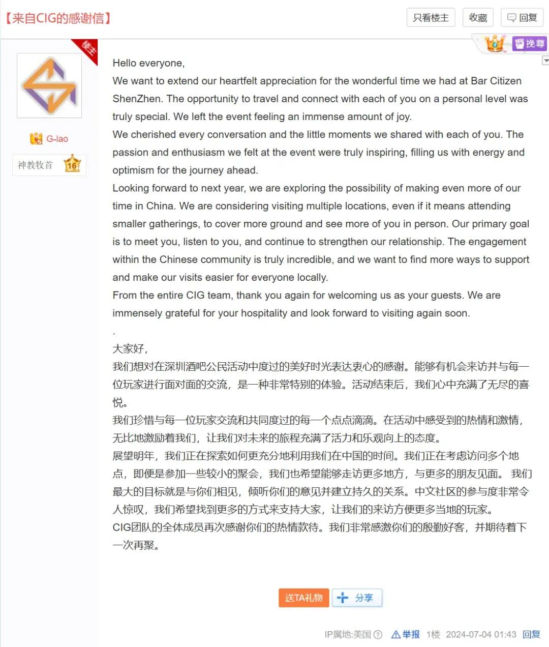 這場風波看起來也驚動了CIG官方,有參與了深圳BC的團隊成員來發帖。分別代表CIG官方和個人來稱讚中國玩家社羣在深圳BC上所表現的熱情,表達希望來年繼續參與此類活動的期許,此外也提到了舉辦更多小型聚會的可能性——這顯然多少也有些來打圓場和安撫人心的意味。