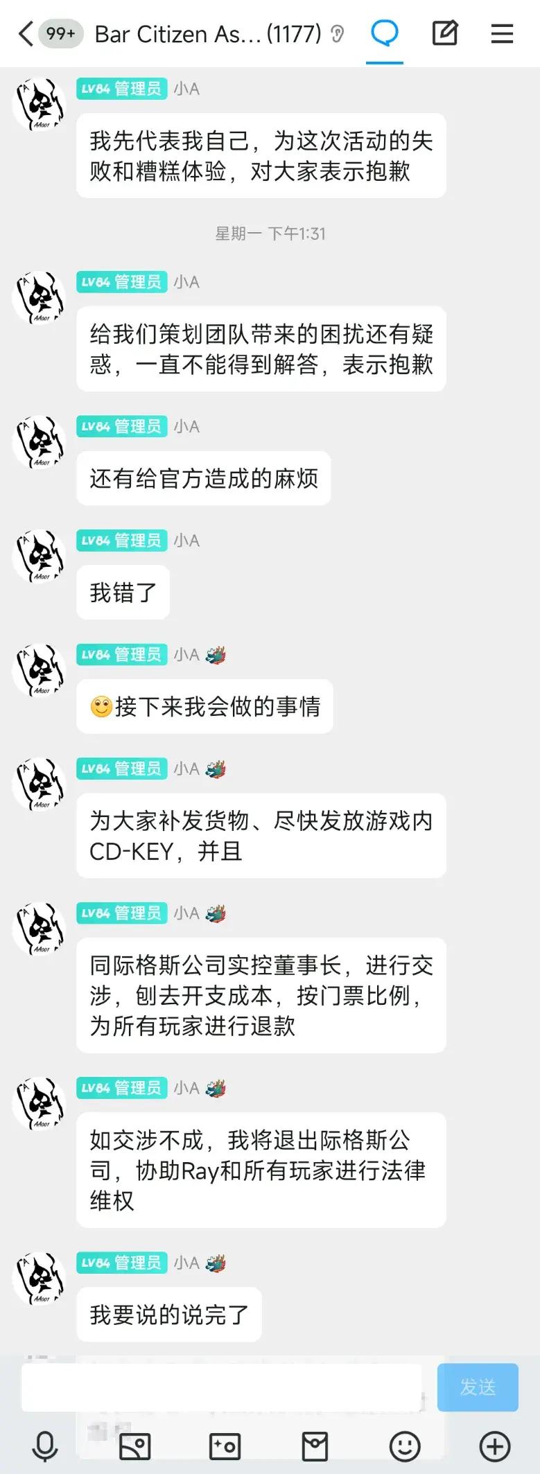 老A表示,他會爲這次搞砸了的BC承擔起全部責任,絕對不會玩消失,一定會把缺失的紀念品補足到玩家手中;聚會預算中未使用的資金,他也一定會和公司交涉,按比例退還給玩家——如果不成功,老A將“退出際格斯公司,和玩家進行法律維權”。