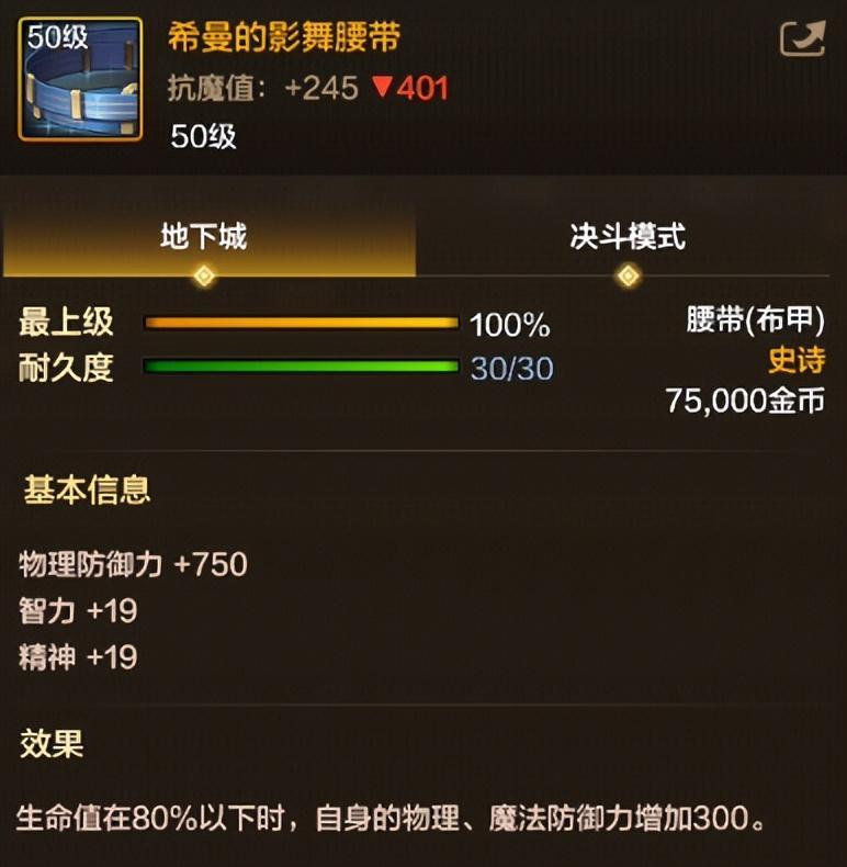 “希曼的影舞腰帶”效果:生命值在80%以下時,自身防禦力增加300。