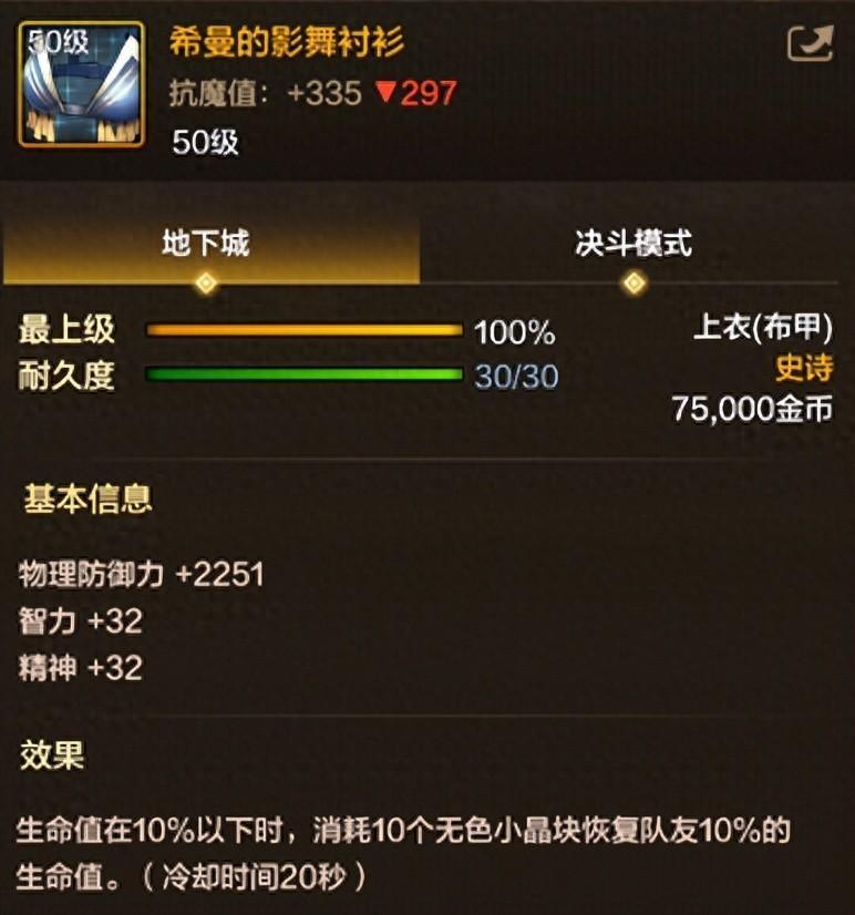“希曼的影舞襯衫”效果:生命值在10%以下時,消耗10個無色小晶塊恢復隊友10%生命值。