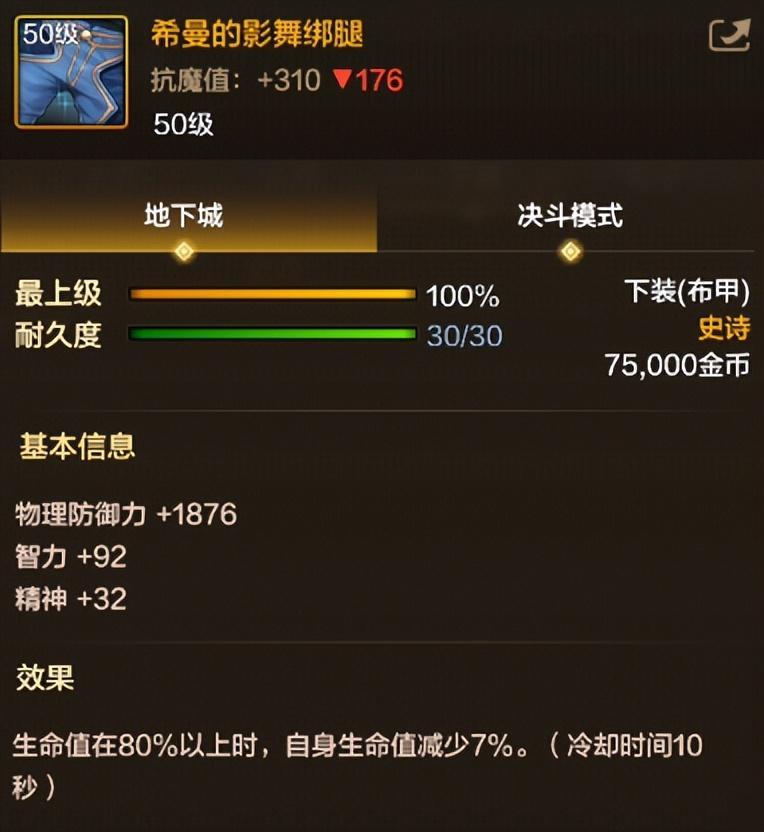 “希曼的影舞綁腿”效果:生命值在80%以上時,自身生命值減少7%。