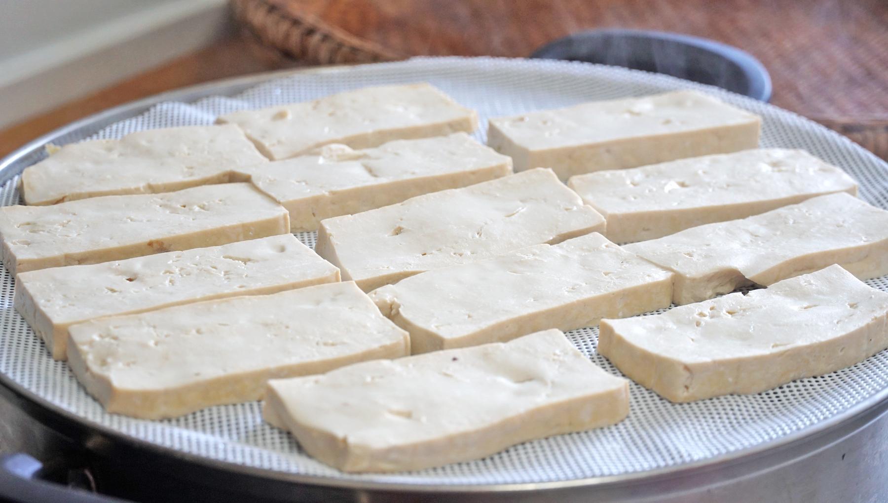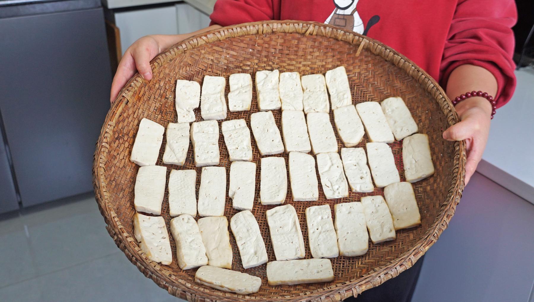 8、壓好了我們再來看一看,豆腐乾勁道了許多,水分壓幹後就更有彈性了。