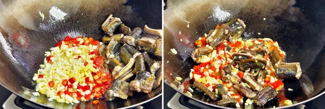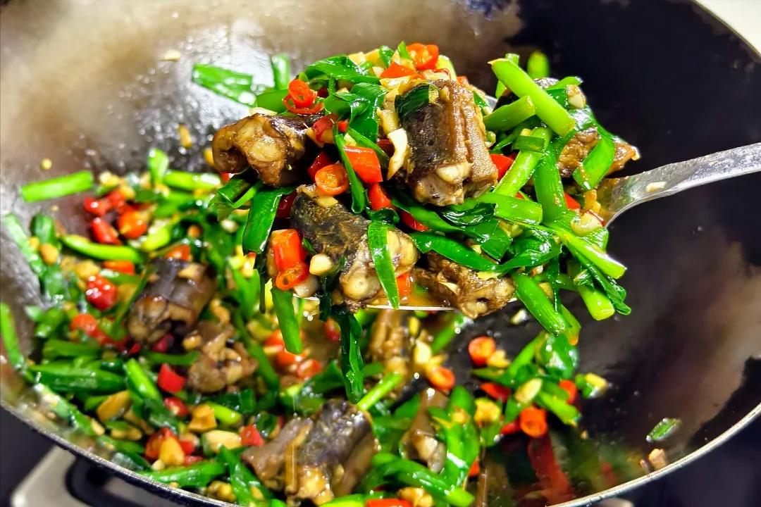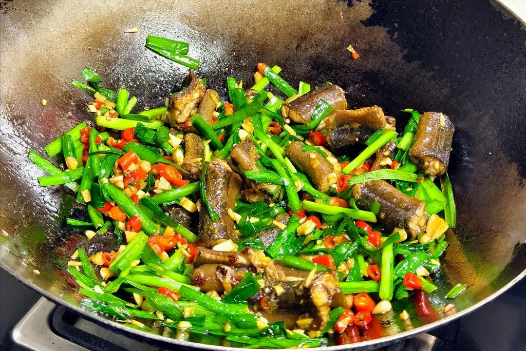 5、然後加韭菜,翻炒均勻起鍋,鱔魚片是醃過的,調料基本都不用加了。