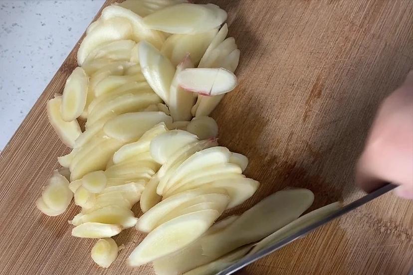 2、將洗淨且晾乾後的嫩姜切成薄片。