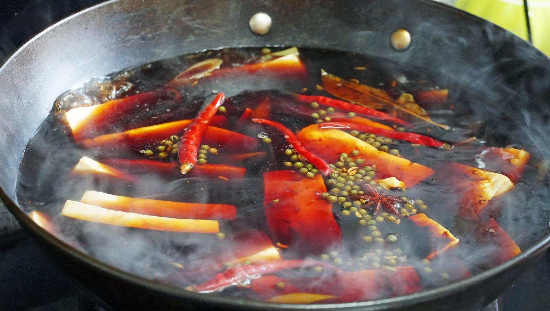 4、起鍋燒水,水燒開把蔥姜放進來,再放點花椒、八角、香葉、小茴香、幹辣椒,調味兒加點鹽、冰糖、生抽、老抽就行。