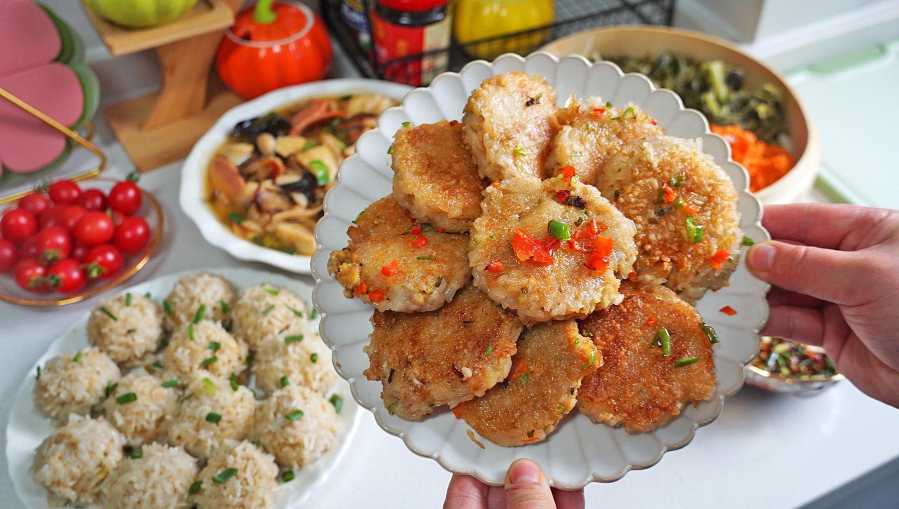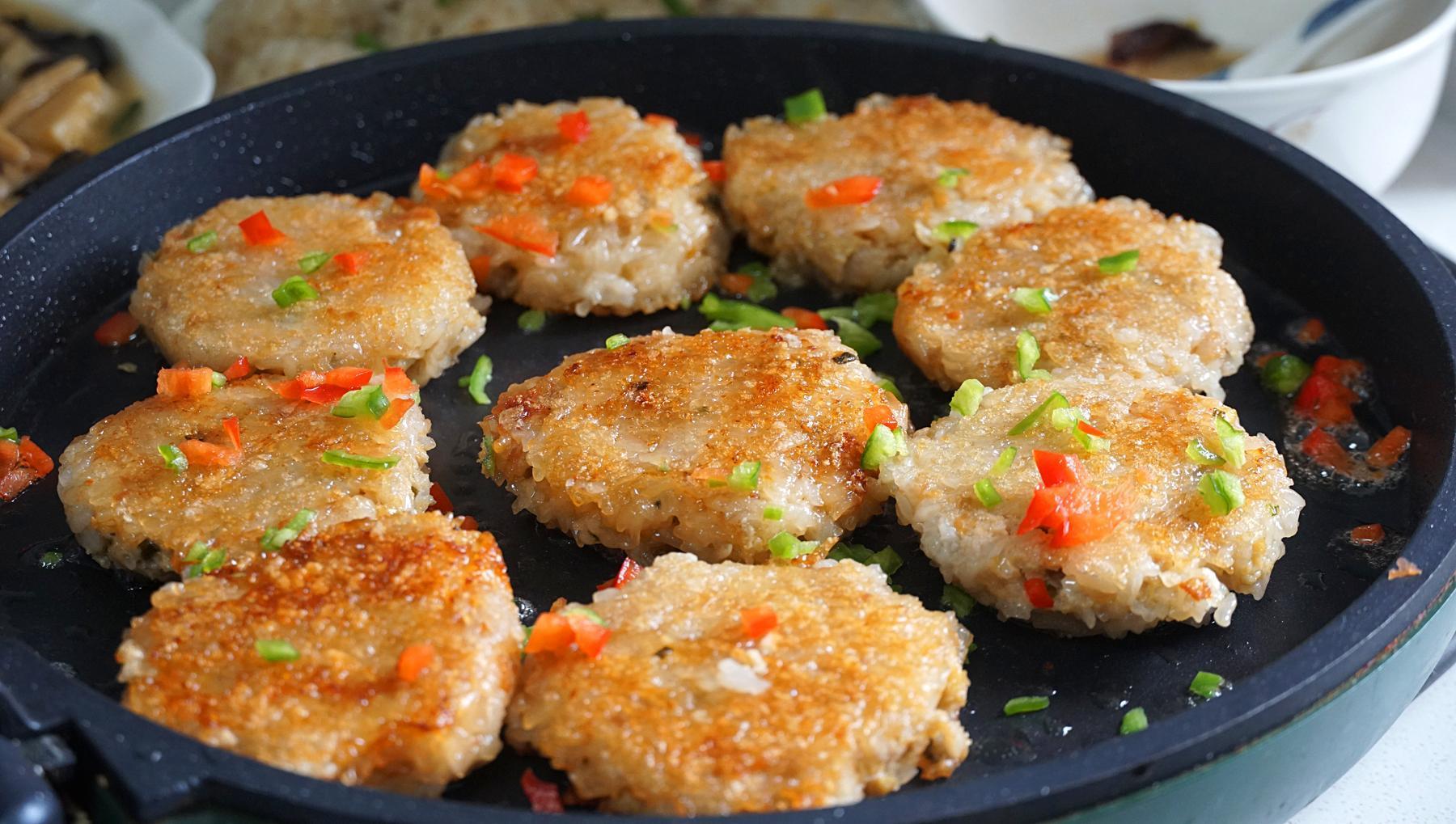 9、糯米餅放到油裏面再拖一下,兩面都煎成這種金黃色焦焦的,撒點青紅辣椒丁點綴一下就給它盛出來,