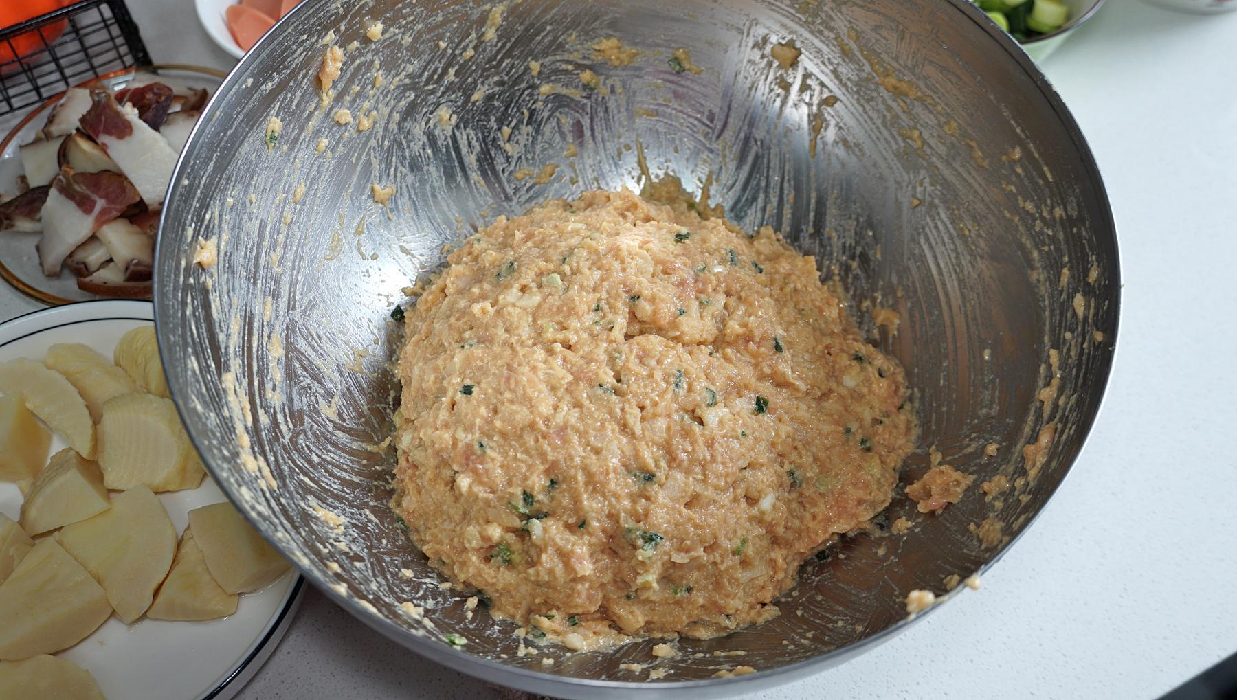 4、攪的時候可以加點澱粉水,喫起來會更嫩,儘量多攪一會兒,攪上勁兒了可以了,如果感覺肉餡兒有點稀的話,可以放冰箱冷藏一會兒