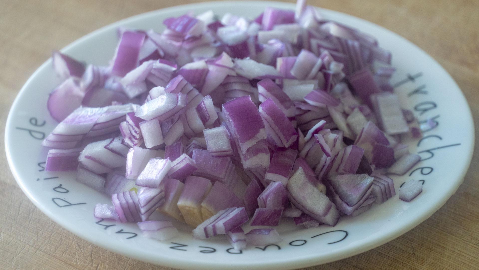 2、接着準備2個青椒,洗淨後去籽切小塊兒,裝入碗裏。