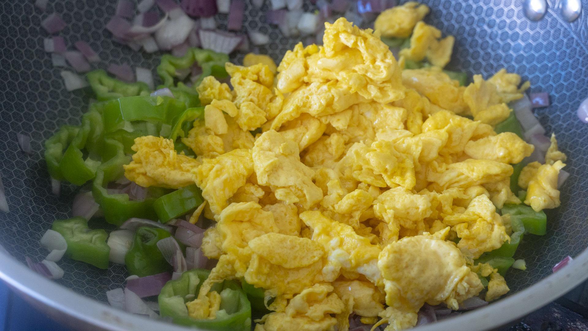 5、起鍋熱油,倒入雞蛋,用筷子劃散成小塊兒,然後盛出來備用。