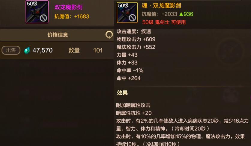 整體提升基本可以持平天脊乾坤劍,天脊乾坤劍附加火屬性,雙龍魔影劍附加暗屬性,只要擁有其中任意一把,劍魂哥就算武器畢業了。