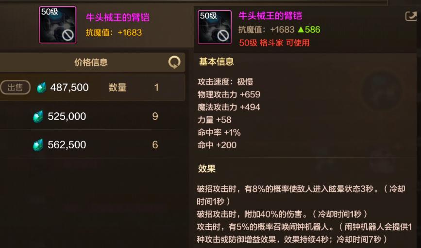 但牛頭械王的臂鎧就不一樣,這可是正兒八經的畢業武器,也就比螺旋隕星臂鎧差一點而已,而且還是格鬥家少有的外觀炫酷的武器。
