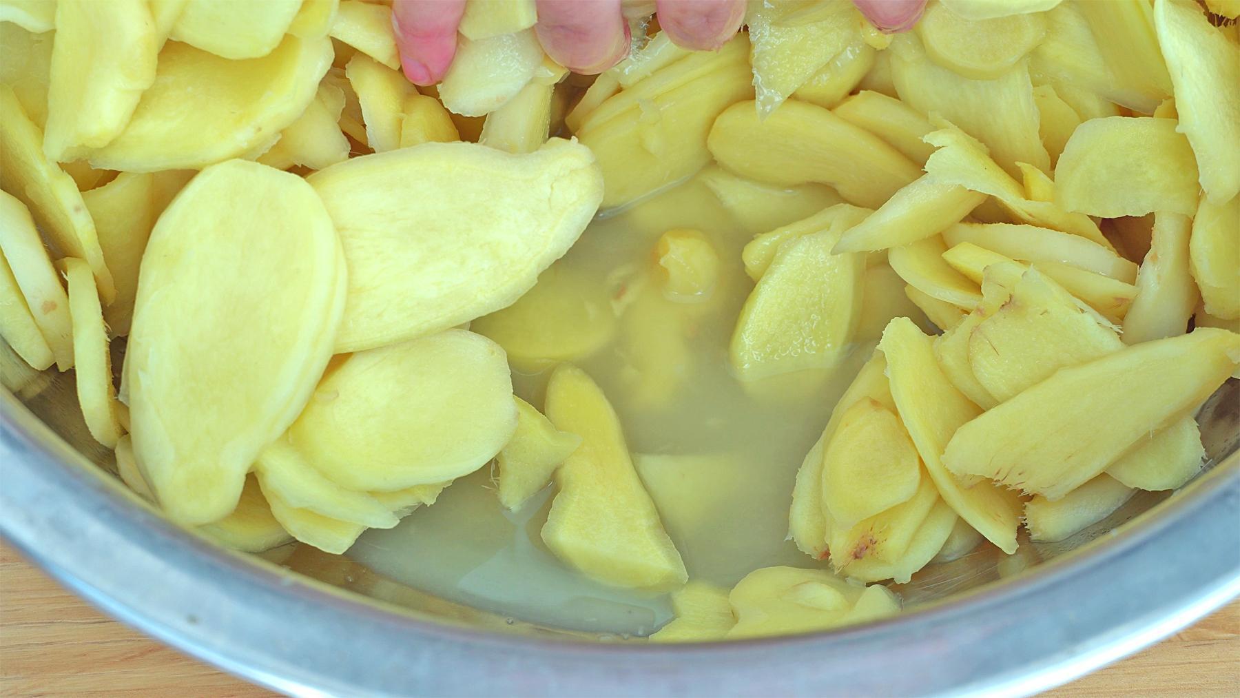2、加30克鹽醃3個小時,去一下生薑的辣味。