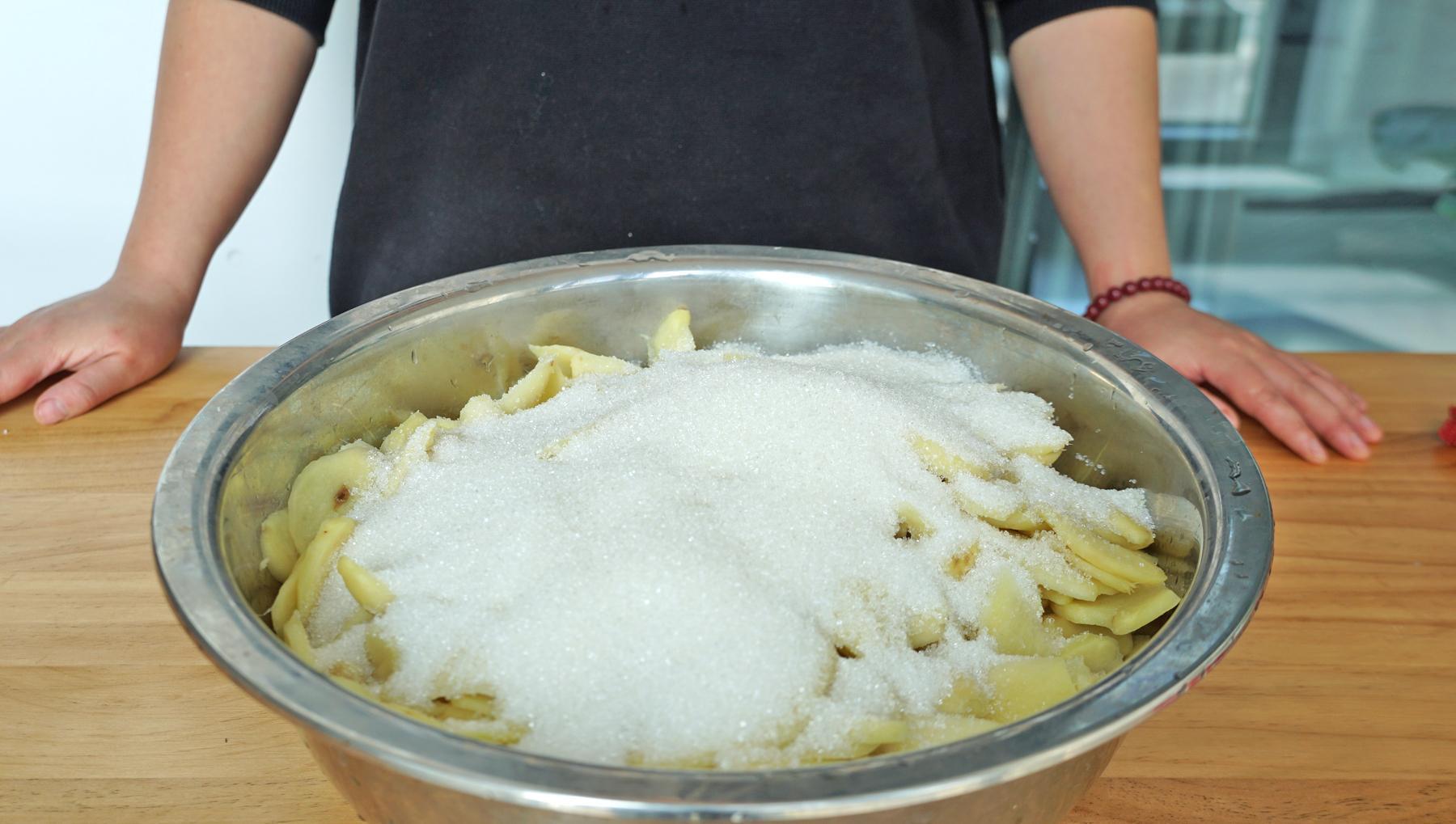 4、表面沒有水了就倒入盆裏,加3斤白糖翻勻,再次醃1個小時,白糖完全融化了就可以開始炒了。