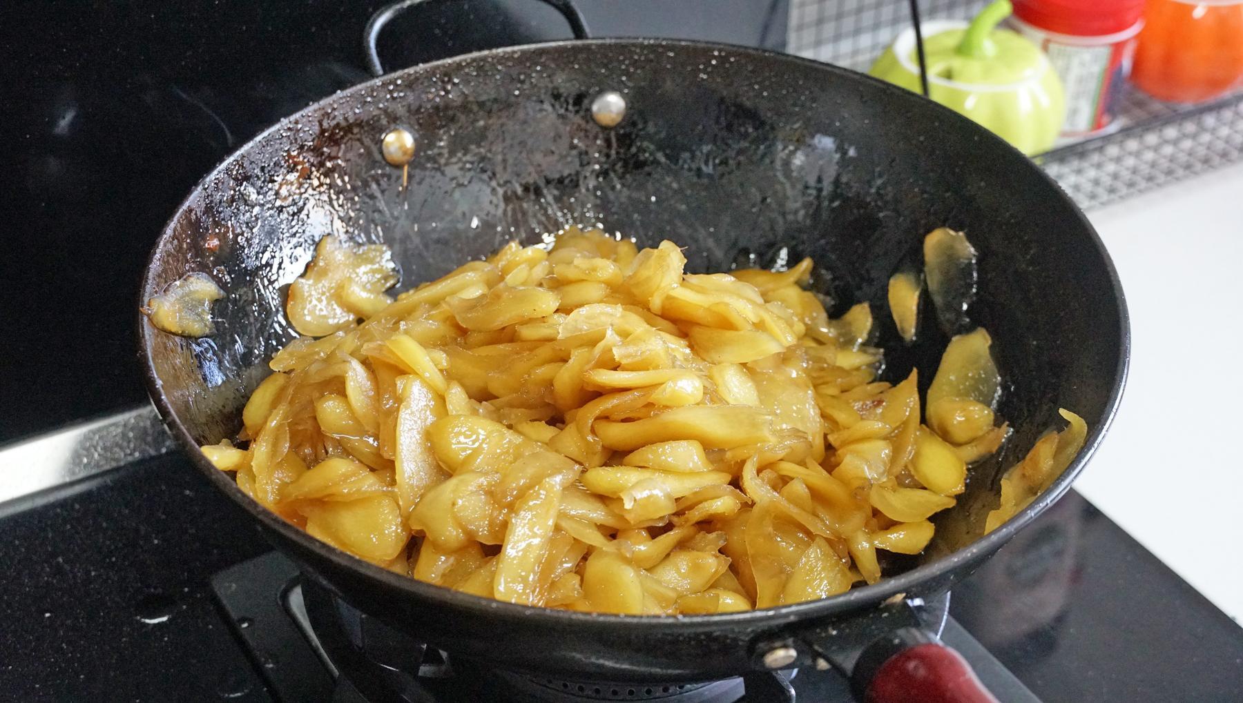 6、鍋裏的糖水越來越少,薑片越來軟,這時候就可以用小火了,不停的翻炒讓鍋裏的糖水完全吸收,直接看不見糖漿狀態,接着再繼續炒個5分鐘。