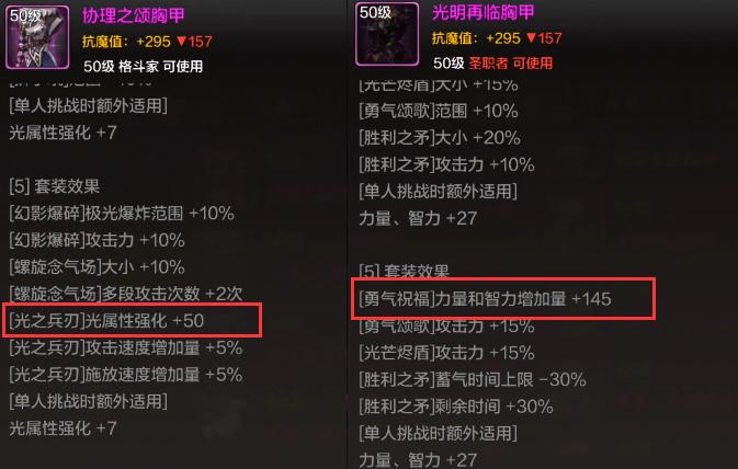 【2】奶媽,推薦套裝“光明再臨套”,5件套給勇氣祝福提供145力智加成,升到“精系列”後提供250力智加成。