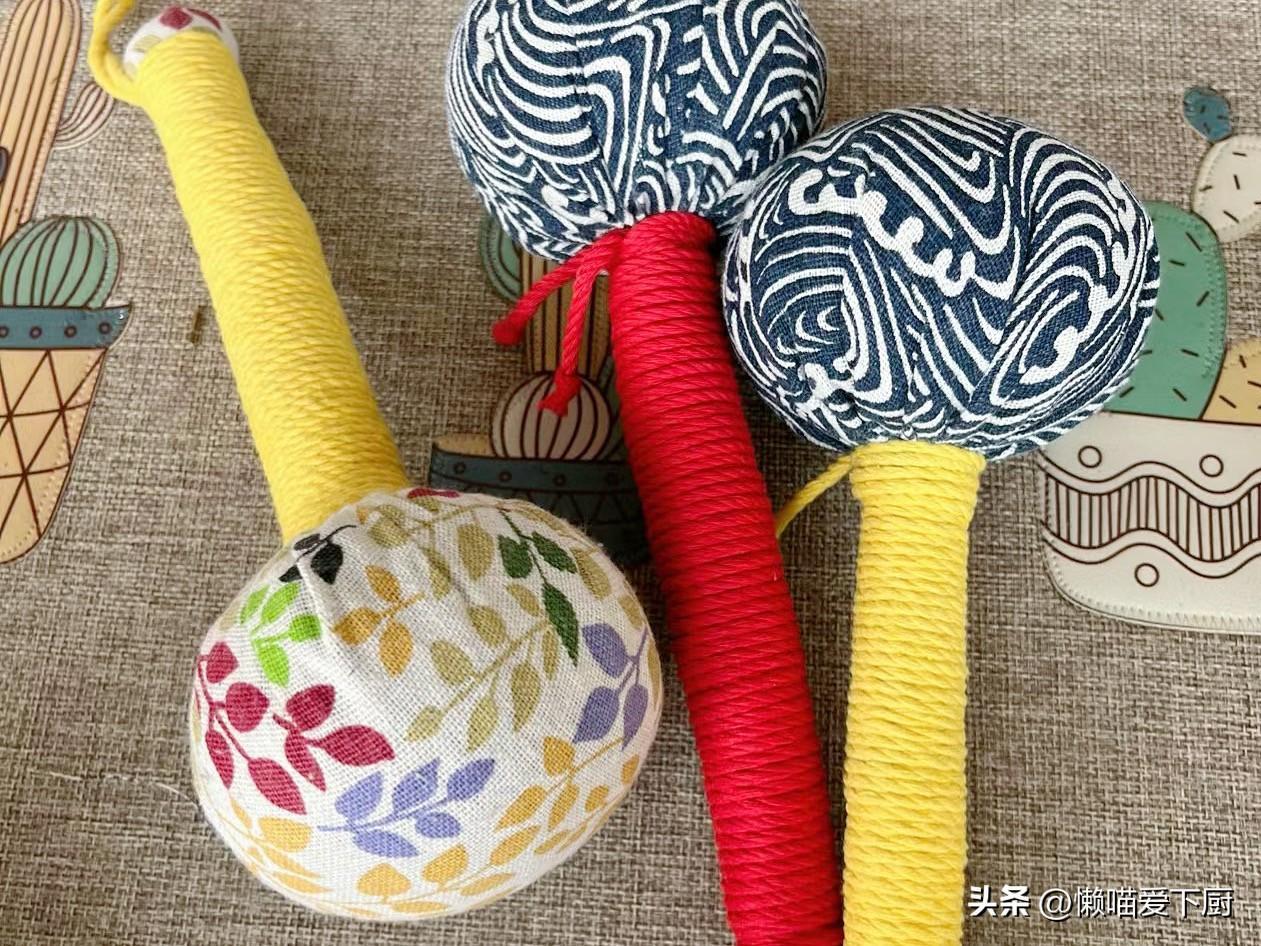 幹艾草剪碎,用一塊無紡布洗臉巾包裹起來,做成一個直徑在8-10cm左右的圓球,最外面再裹上一塊漂亮的麻布,然後將一根適當粗細的木棍放進艾草中,用棉麻線一圈一圈繞起來,連同麻布一起紮緊即可。