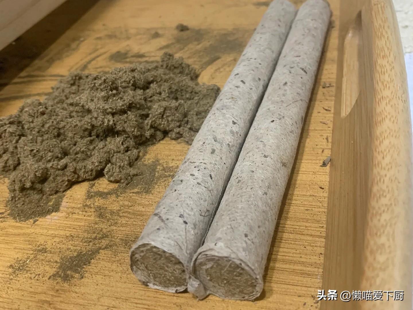 曬乾的艾草只用艾葉部分,記得要將莖稈挑揀出來,用手將艾草搓成絨狀,覺得費勁的話也可以直接用打粉機攪碎,然後過篩掉艾粉,只留下艾絨,再準備一些捲紙筒,將艾絨塞進去,壓實後封口即可。