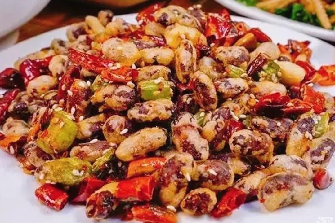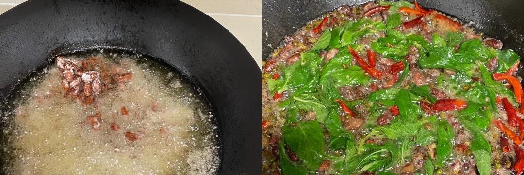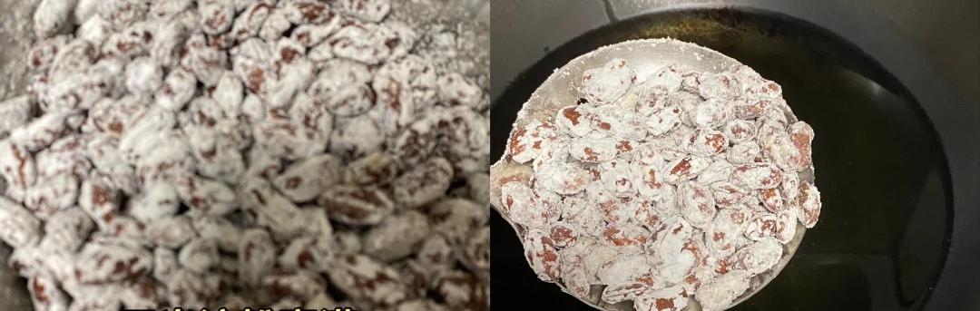 2、鍋中倒入寬油,油溫七成倒入紅豆中火炸至金黃,紅豆倒入鍋中不要馬上劃散,過個兩分鐘再慢慢劃散開。紅豆炸至金黃後,倒入幹辣椒炸香,再倒入苦菜炸幹水分。炸好後一起撈出瀝油。