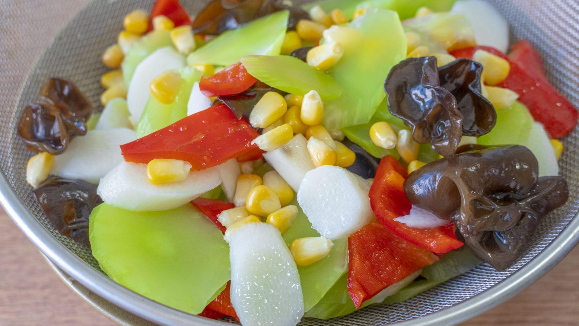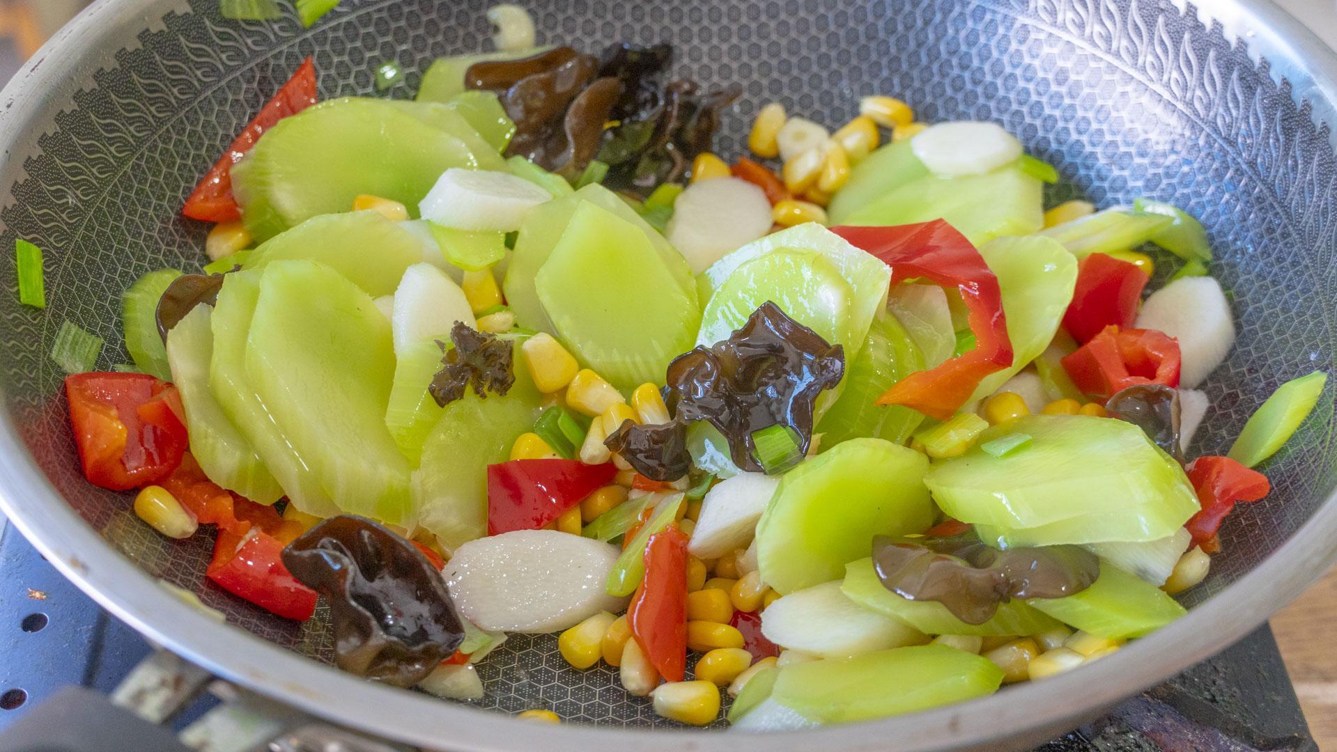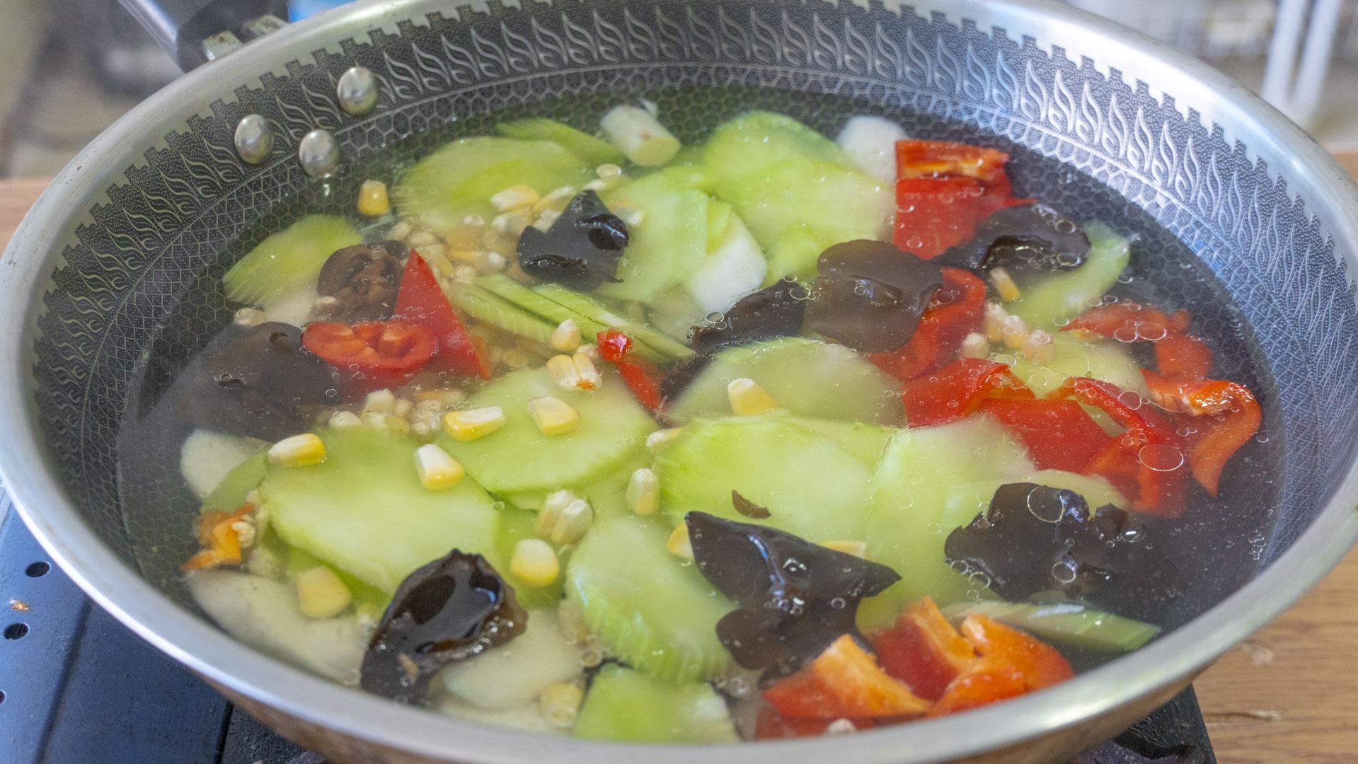 4、接着起鍋燒水,水開加一勺油,然後把山藥、萵筍、辣椒倒進來焯水,再來一把玉米和一把木耳,一起焯水一分鐘。