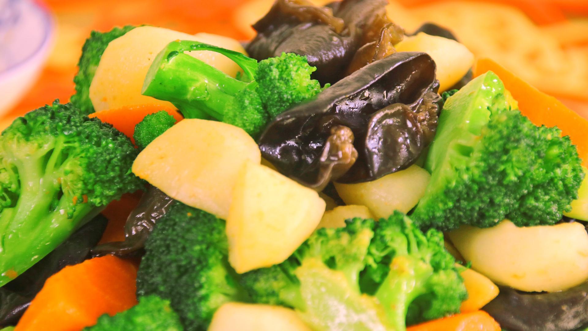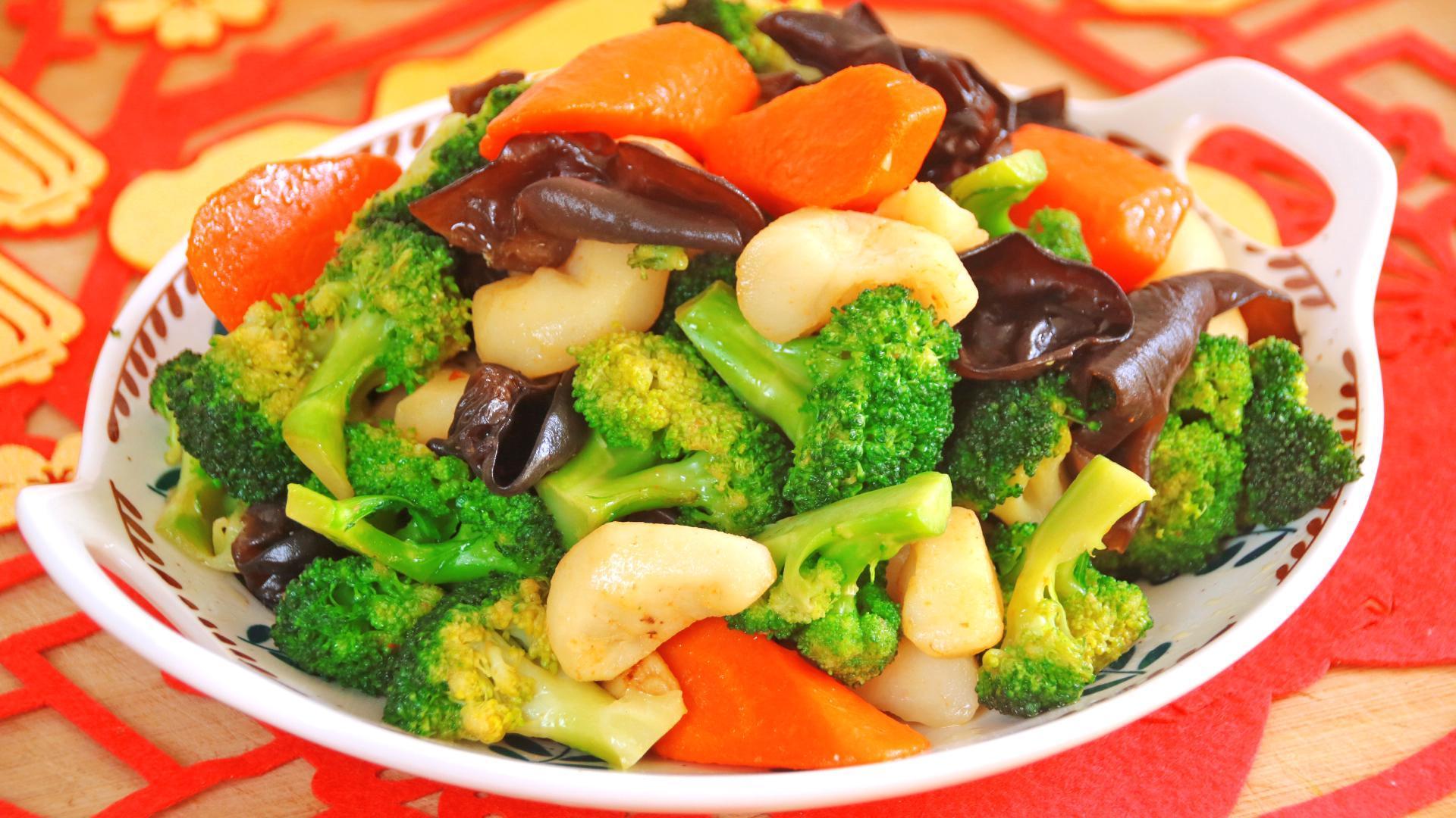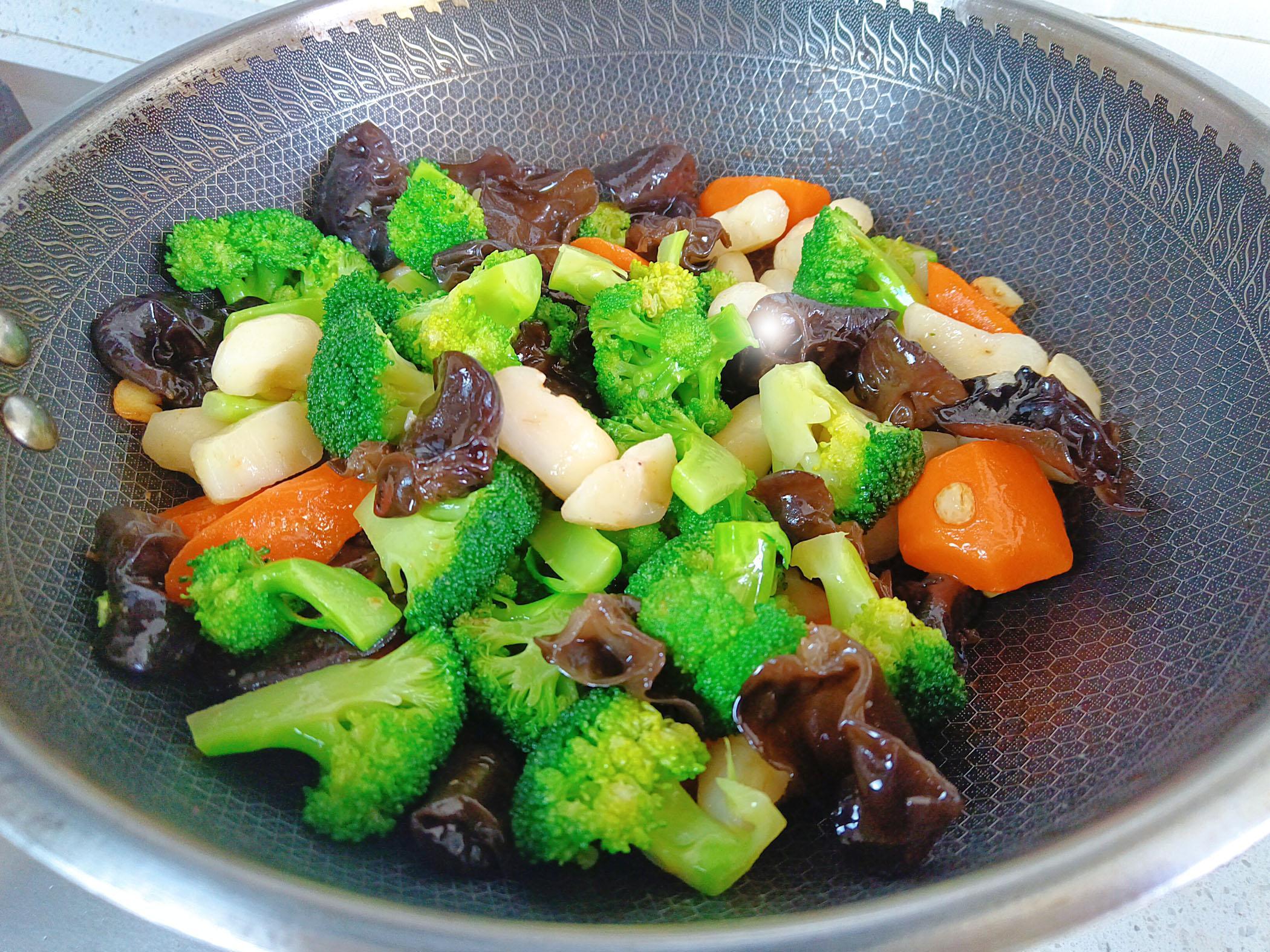 8、起鍋熱油,下蒜末爆香,接着把焯過水的西蘭花、胡蘿蔔、木耳、荸薺都倒進來。大火翻炒1分鐘後簡單調味、鹽、糖、雞精、生抽、少許蠔油。